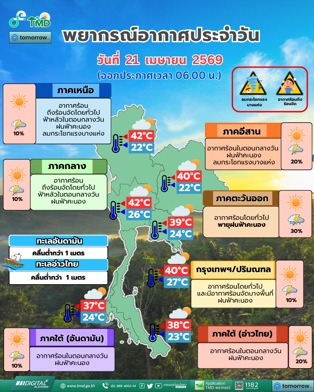 21 เม.ย.2569-กรมอุตุนิยมวิทยา พยากรณ์อากาศ 24 ชั่วโมงข้างหน้า บริเวณประเทศไทยตอนบนจะมีฝนลดลง แต่ยังคงมีฝนฟ้าคะนองเกิดขึ้นได้บางแห่ง โดยมีอากาศร้อนโดยทั่วไป และมีอากาศร้อนจัดบางพื้นที่บริเวณภาคเหนือ ภาคตะวันออกเฉียงเหนือ และภาคกลาง เนื่องจากหย่อมความกดอากาศต่ำเนื่องจากความร้อนปกคลุมประเทศไทยตอนบน ในขณะที่ลมใต้และลมตะวันออกเฉียงใต้ที่พัดนำความชื้นจากอ่าวไทยและทะเลจีนใต้เข้ามาปกคลุมภาคตะวันออกเฉียงเหนือ ภาคตะวันออก และอ่าวไทยตอนบนมีกำลังอ่อนลง ขอให้ประชาชนดูแลรักษาสุขภาพเนื่องจากสภาวะอากาศร้อนถึงร้อนจัด และระวังอันตรายจากฝนฟ้าคะนองและลมกระโชกแรงในระยะนี้ไว้ด้วย