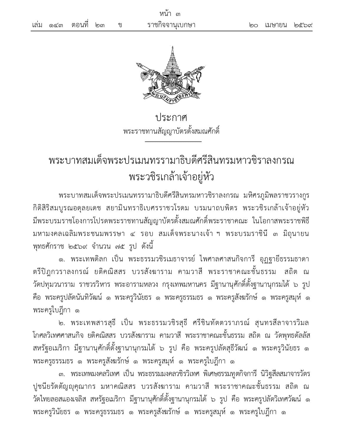 พระบาทสมเด็จพระปรเมนทรรามาธิบดีศรีสินทรมหาวชิราลงกรณ มหิศรภูมิพลราชวรางกูร กิติสิริสมบูรณอดลยเดช สยามินทราธิเบศรราราชวโรดม บรมนาถบพิตร พระวชิรเกล้าเจ้าอยู่หัว มีพระบรมราชโองการโปรดพระราชทานสัญญาบัตรตั้งสมณศักดิ์พระราชาคณะ ในโอกาสพระราชพิธี มหามงคลเฉลิมพระชนมพรรษา ๔ รอบ สมเด็จพระนางเจ้า ฯ พระบรมราชินี ๓ มิถุนายน พุทธศักราช ๒๕๖๙ จำนวน ๗๕ รูป ดังนี้
