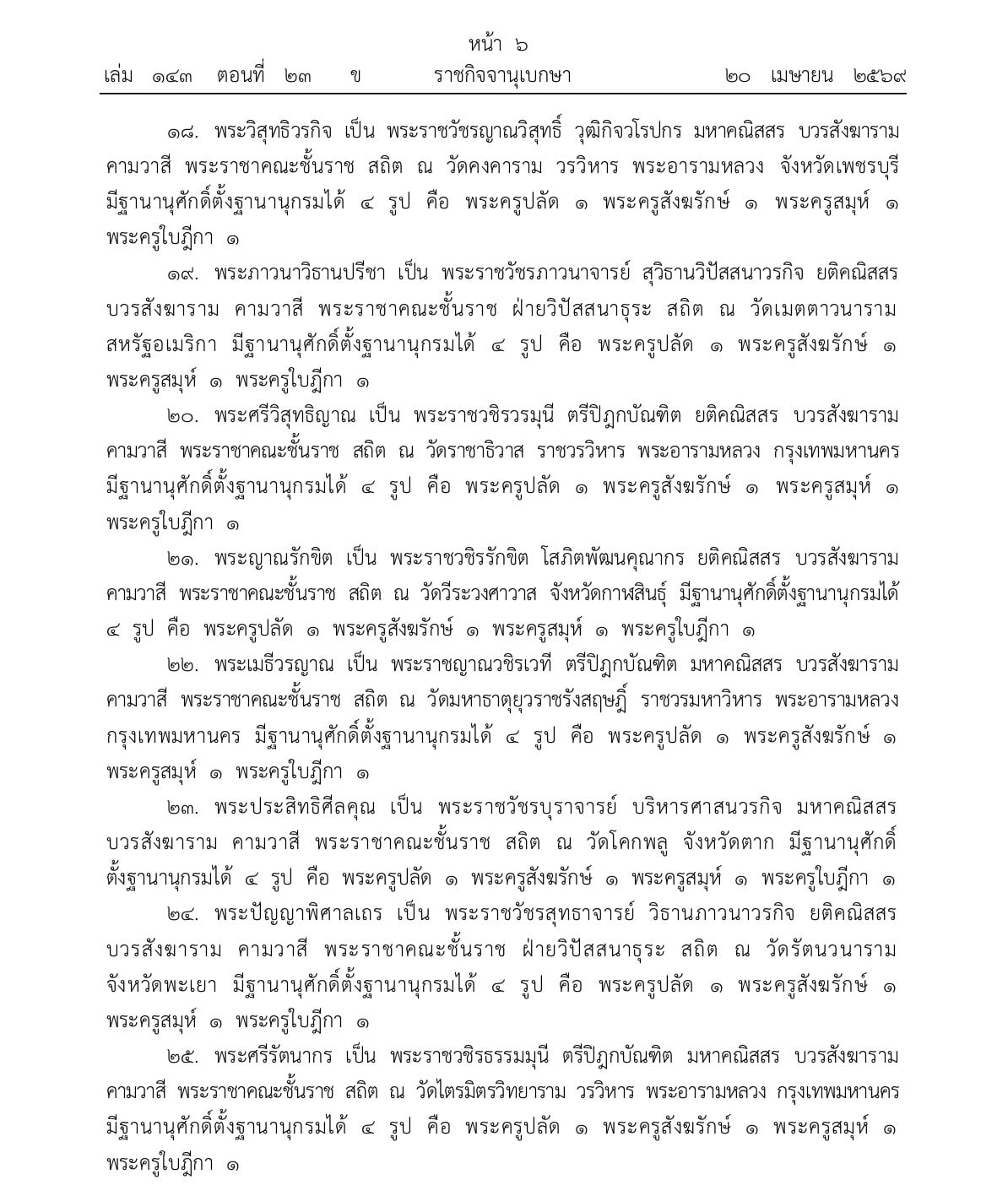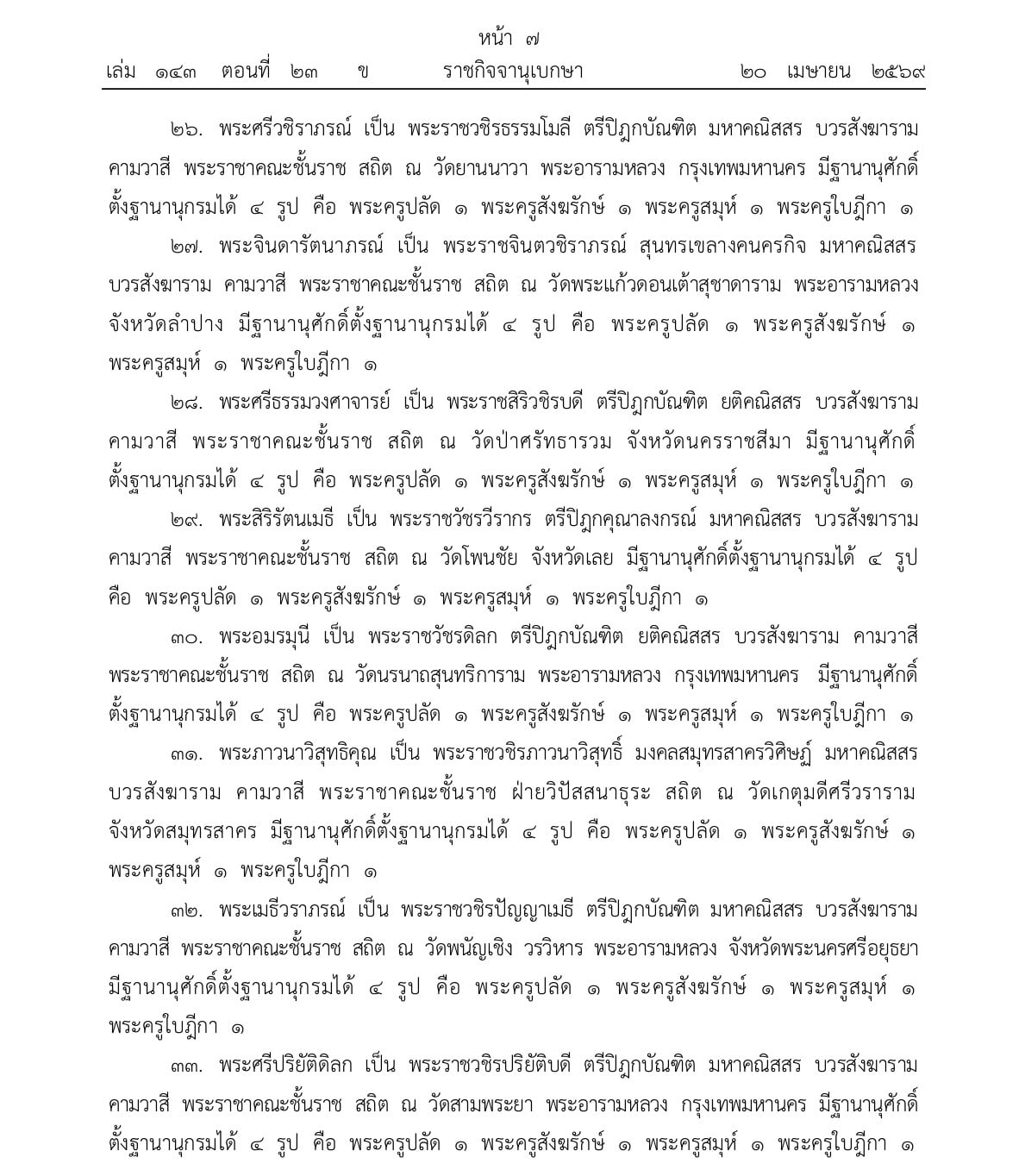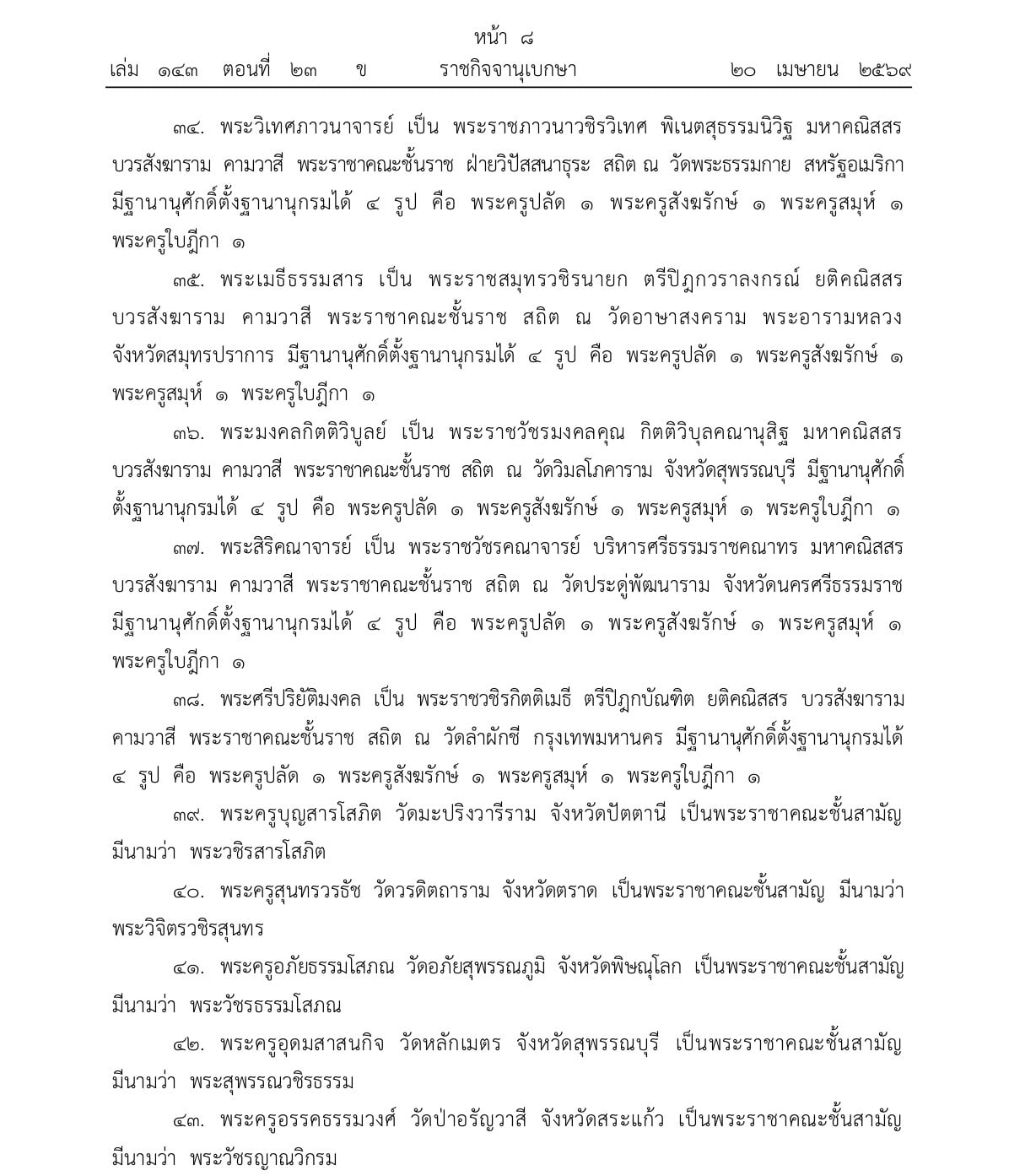 ราชกิจจานุเบกษา เผยแพร่ประกาศพระราชทานสัญญาบัตรตั้งสมณศักดิ์