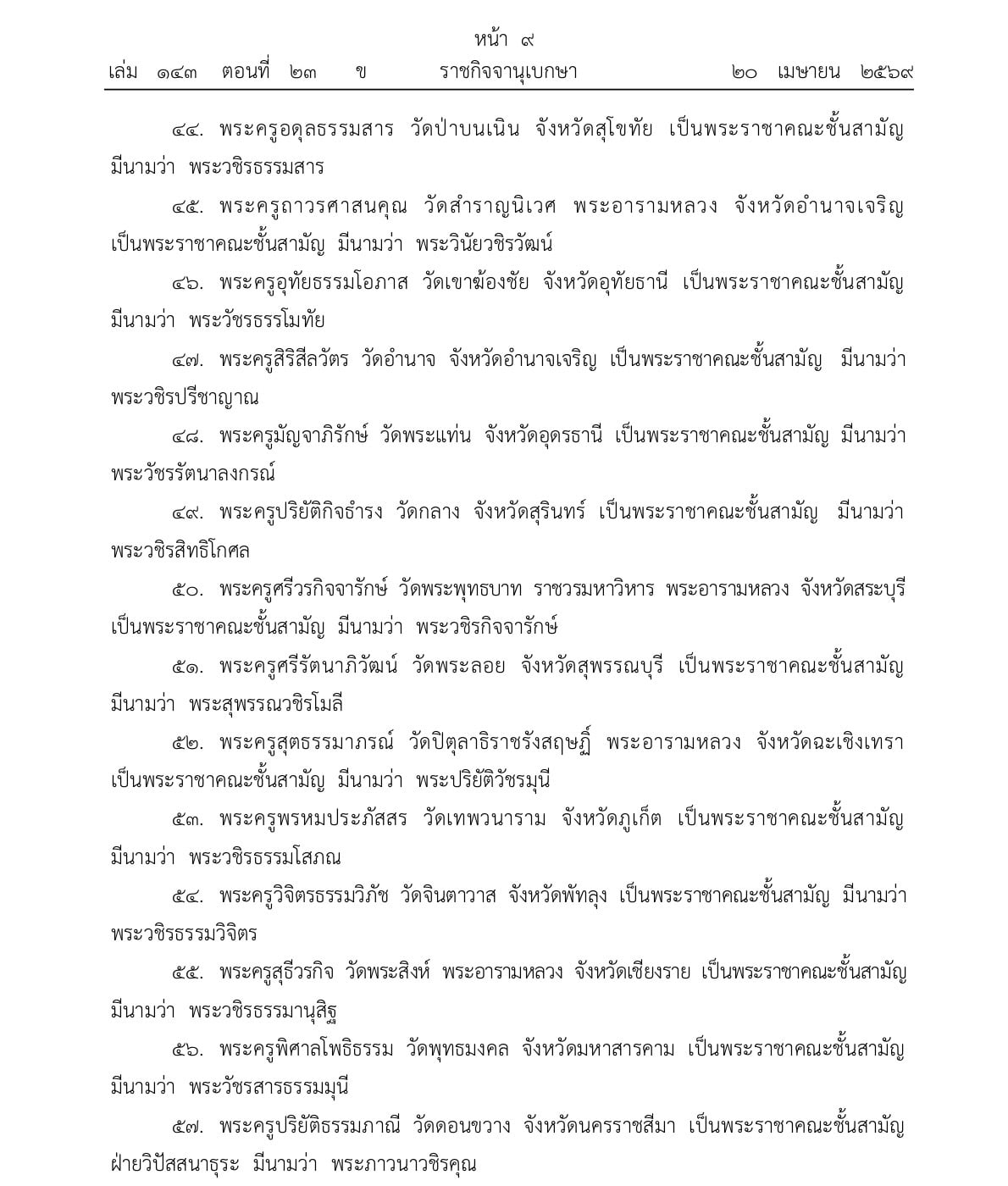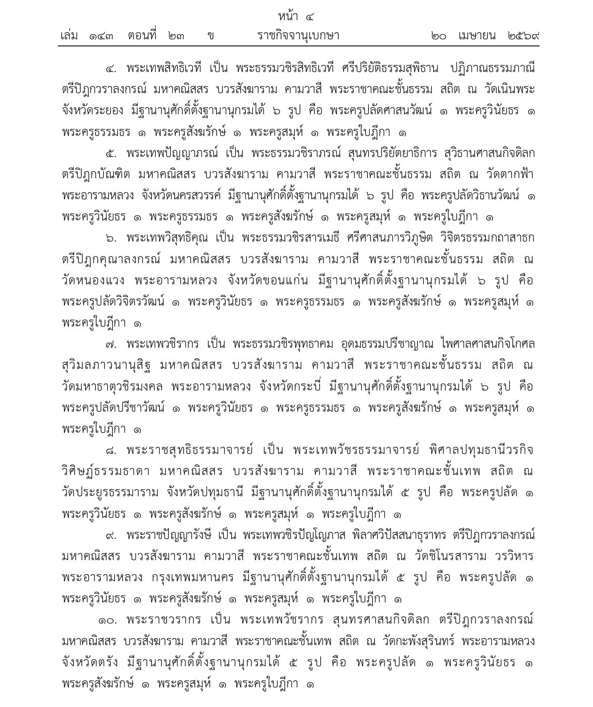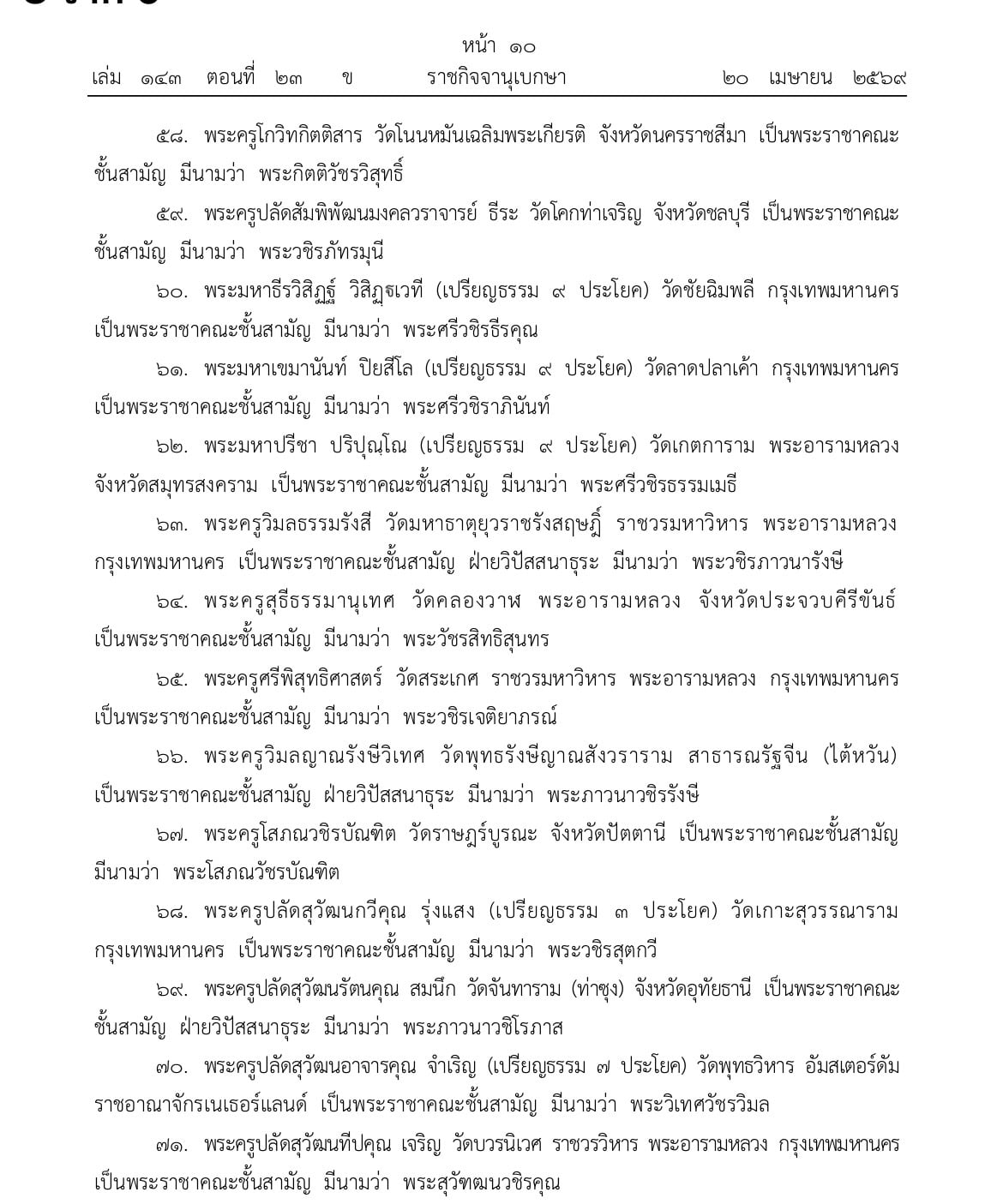ราชกิจจานุเบกษา เผยแพร่ประกาศพระราชทานสัญญาบัตรตั้งสมณศักดิ์