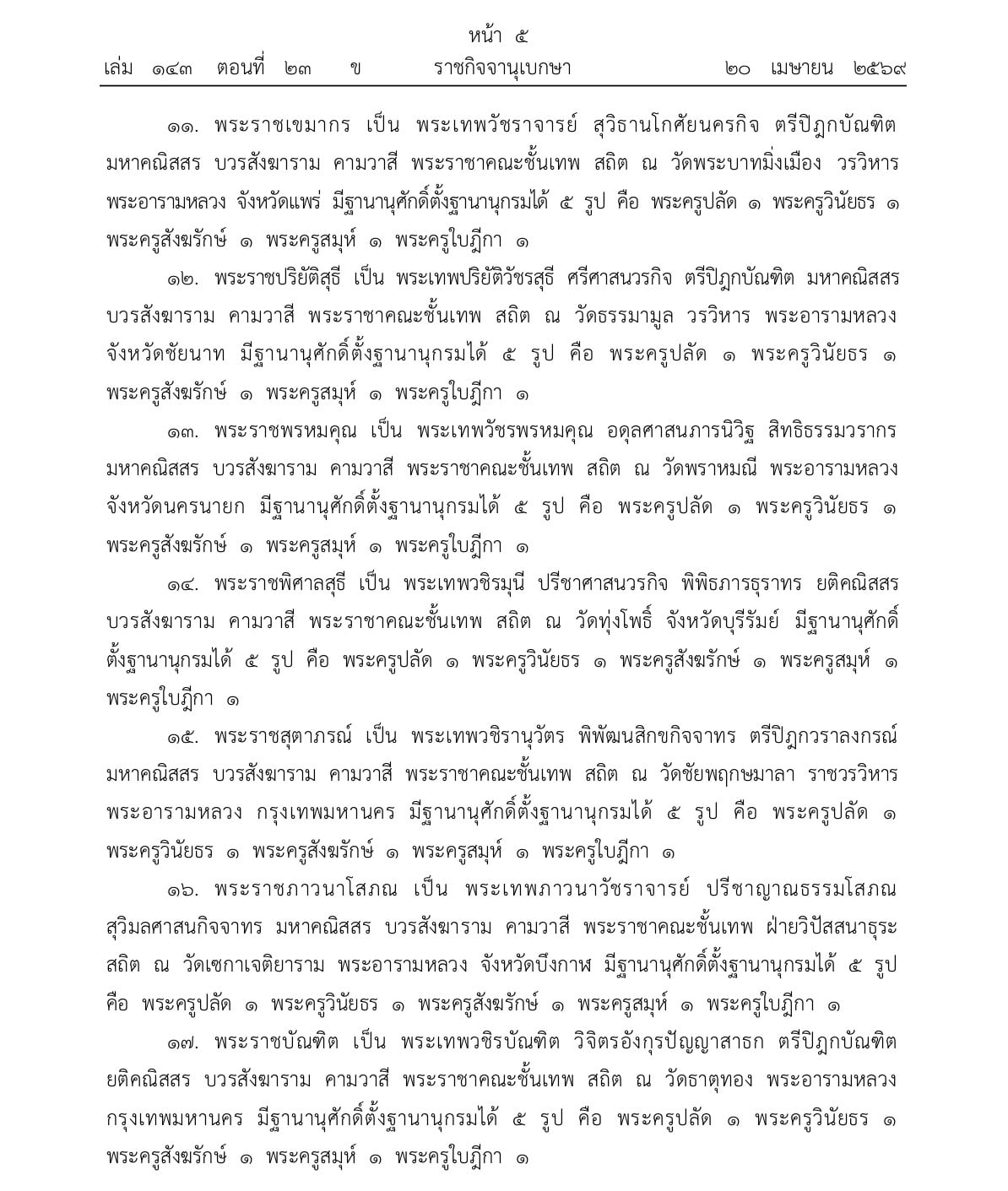 โปรดพระราชทานสัญญาบัตรตั้งสมณศักดิ์พระราชาคณะ จำนวน 5 รูป