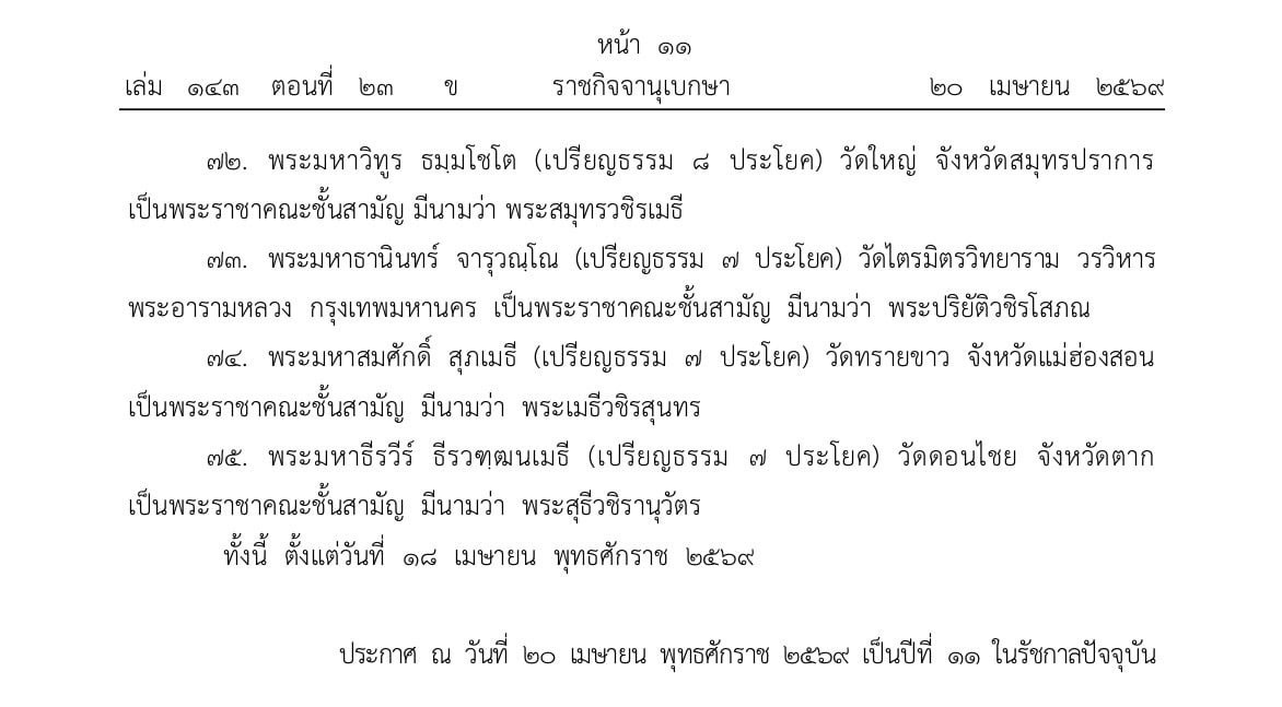 21 เมษายน 2569 - เว็บไซต์ราชกิจจานุเบกษา เผยแพร่ประกาศ พระราชทานสัญญาบัตรตั้งสมณศักดิ์