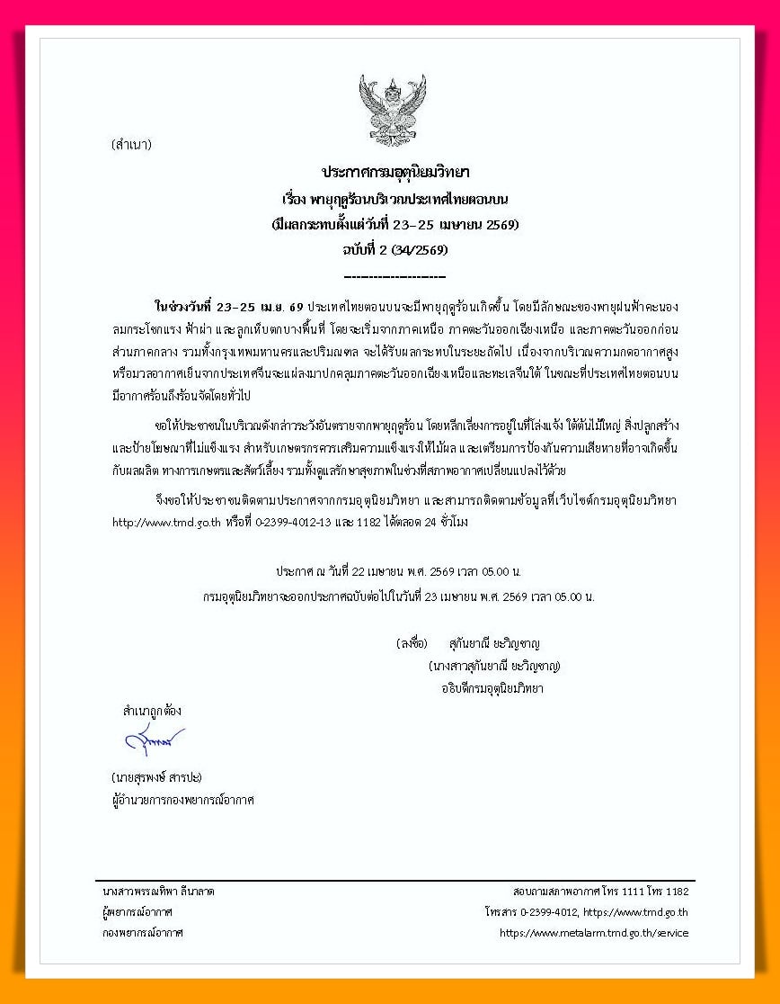 22 เม.ย.2569 - นางสาวสุกันยาณี ยะวิญชาญ อธิบดีกรมอุตุนิยมวิทยา ออกประกาศกรมอุตุนิยมวิทยา เรื่อง พายุฤดูร้อนบริเวณประเทศไทยตอนบน (มีผลกระทบตั้งแต่วันที่ 23–25 เมษายน 2569) ฉบับที่ 2 (34/2569)