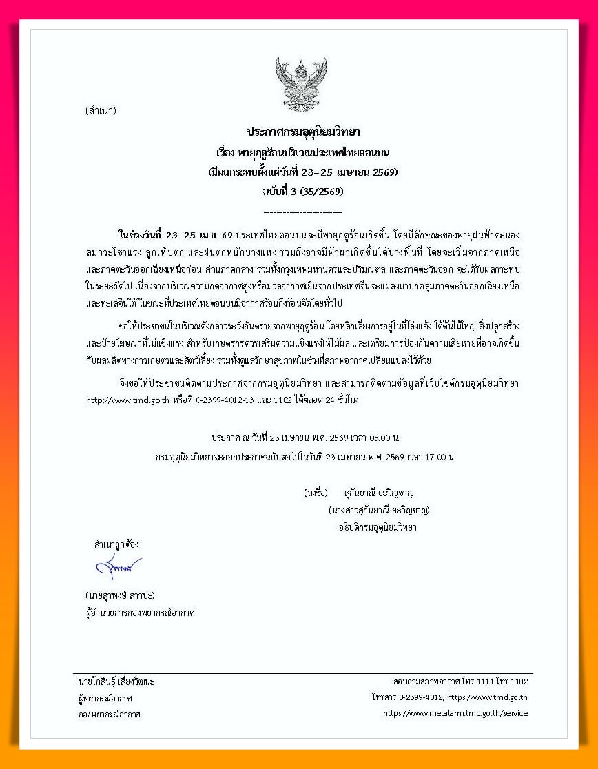 23 เม.ย.2569 - นางสาวสุกันยาณี ยะวิญชาญ อธิบดีกรมอุตุนิยมวิทยา ออกประกาศกรมอุตุนิยมวิทยา เรื่อง พายุฤดูร้อนบริเวณประเทศไทยตอนบน (มีผลกระทบตั้งแต่วันที่ 23–25 เมษายน 2569) ฉบับที่ 3 (35/2569) ระบุว่า ในช่วงวันที่ 23–25 เม.ย. 69 ประเทศไทยตอนบนจะมีพายุฤดูร้อนเกิดขึ้น โดยมีลักษณะของพายุฝนฟ้าคะนอง ลมกระโชกแรง ลูกเห็บตก และฝนตกหนักบางแห่ง รวมถึงอาจมีฟ้าผ่าเกิดขึ้นได้บางพื้นที่ โดยจะเริ่มจากภาคเหนือ และภาคตะวันออกเฉียงเหนือก่อน ส่วนภาคกลาง รวมทั้งกรุงเทพมหานครและปริมณฑล และภาคตะวันออก จะได้รับผลกระทบในระยะถัดไป เนื่องจากบริเวณความกดอากาศสูงหรือมวลอากาศเย็นจากประเทศจีนจะแผ่ลงมาปกคลุมภาคตะวันออกเฉียงเหนือและทะเลจีนใต้ ในขณะที่ประเทศไทยตอนบนมีอากาศร้อนถึงร้อนจัดโดยทั่วไป