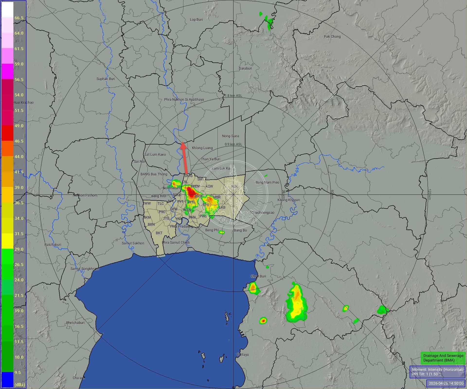 26 เม.ย.2569-เพจศูนย์ป้องกันน้ำท่วม กรุงเทพมหานคร รายงานเวลา 15.15 น. ฝนเล็กน้อยถึงปานกลางเขตห้วยขวาง จตุจักร หลักสี่ ลาดพร้าว บางเขน วังทองหลาง บางกะปิ บึงกุ่ม สะพานสูง คันนายาว คลองสามวา ลาดกระบัง มีนบุรี เคลื่อนตัวทิศเหนือ แนวโน้มคงที่ ปริมาณฝนรวมสูงสุดเขตบางเขน 26.5 มม.
