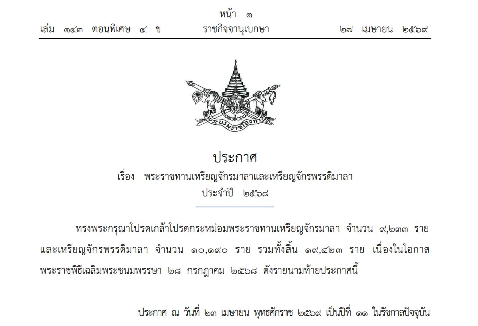 28 เมษายน 2569 - เว็บไซต์ราชกิจจานุเบกษา เผยแพร่ประกาศเรื่อง พระราชทานเหรียญจักรมาลาและเหรียญจักรพรรดิมาลาประจำปี ๒๕๖๘