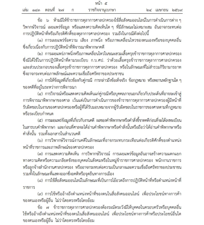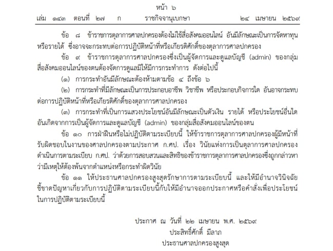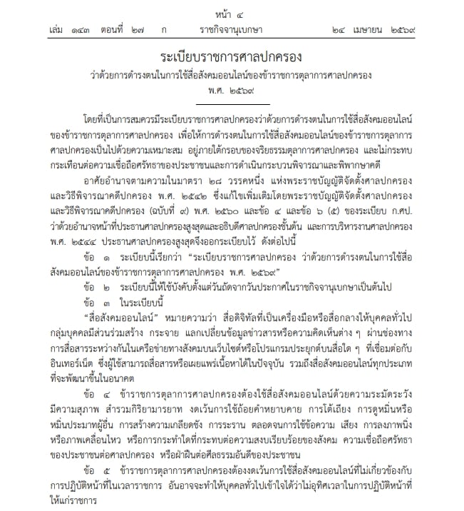 28 เมษายน 2569 – เว็บไซต์ราชกิจจานุเบกษา เผยแพร่ระเบียบราชการศาลปกครองว่าด้วยการดำรงตนในการใช้สื่อสังคมออนไลน์ของข้าราชการตุลาการศาลปกครองพ.ศ. ๒๕๖๙