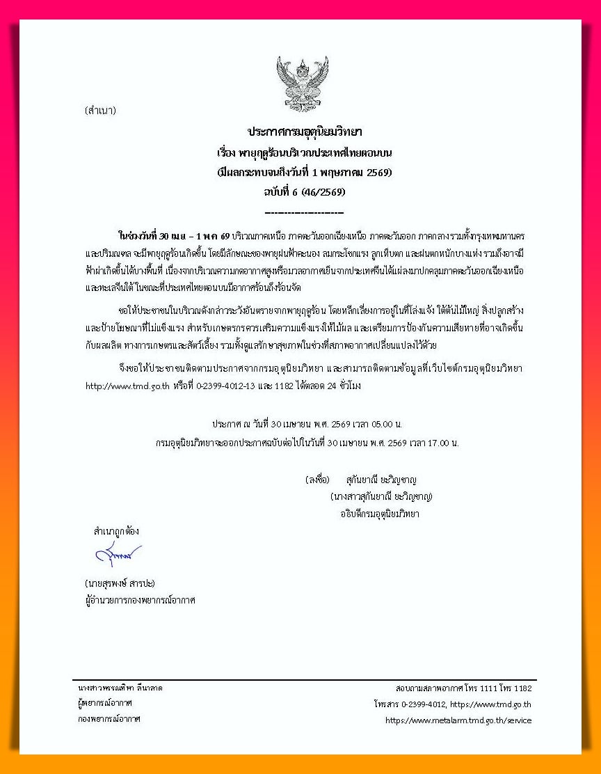 30 เม.ย.2569 - นางสาวสุกันยาณี ยะวิญชาญ อธิบดีกรมอุตุนิยมวิทยา ออกประกาศกรมอุตุนิยมวิทยา เรื่อง พายุฤดูร้อนบริเวณประเทศไทยตอนบน (มีผลกระทบจนถึงวันที่ 1 พฤษภาคม 2569) ฉบับที่ 6 (46/2569) ระบุว่า ในช่วงวันที่ 30 เม.ย. – 1 พ.ค. 69 บริเวณภาคเหนือ ภาคตะวันออกเฉียงเหนือ ภาคตะวันออก ภาคกลาง รวมทั้งกรุงเทพมหานครและปริมณฑล จะมีพายุฤดูร้อนเกิดขึ้น โดยมีลักษณะของพายุฝนฟ้าคะนอง ลมกระโชกแรง ลูกเห็บตก และฝนตกหนักบางแห่ง รวมถึงอาจมีฟ้าผ่าเกิดขึ้นได้บางพื้นที่ เนื่องจากบริเวณความกดอากาศสูงหรือมวลอากาศเย็นจากประเทศจีนได้แผ่ลงมาปกคลุมภาคตะวันออกเฉียงเหนือและทะเลจีนใต้ ในขณะที่ประเทศไทยตอนบนมีอากาศร้อนถึงร้อนจัด
