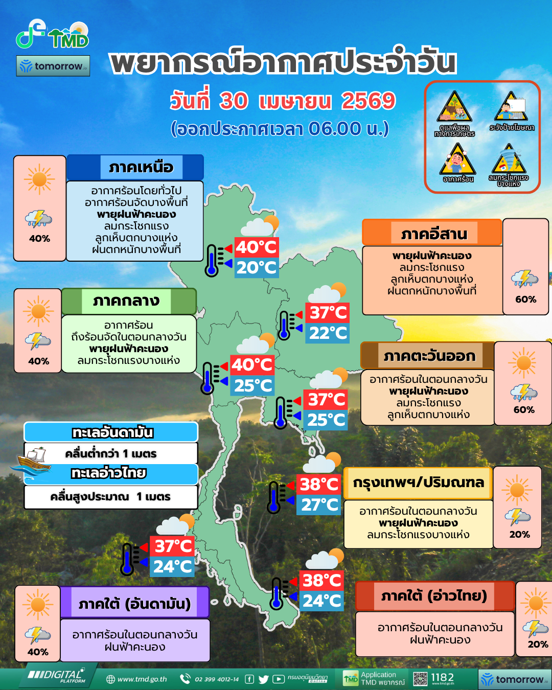 30 เม.ย.2569 - กรมอุตุนิยมวิทยาได้พยากรณ์อากาศ 24 ชั่วโมงข้างหน้าในลักษณะทั่วไป ว่าบริเวณภาคเหนือ ภาคตะวันออกเฉียงเหนือ ภาคตะวันออก ภาคกลาง รวมทั้งกรุงเทพมหานครและปริมณฑล จะมีพายุฤดูร้อนเกิดขึ้น โดยมีลักษณะของพายุฝนฟ้าคะนอง ลมกระโชกแรง และลูกเห็บตกบางแห่ง รวมถึงอาจมีฟ้าผ่าเกิดขึ้นได้ เนื่องจากบริเวณความกดอากาศสูงหรือมวลอากาศเย็นจากประเทศจีนได้แผ่ลงมาปกคลุมภาคตะวันออกเฉียงเหนือ และทะเลจีนใต้แล้ว ในขณะที่ประเทศไทยตอนบนมีอากาศร้อนถึงร้อนจัด ขอให้ประชาชนในบริเวณดังกล่าวระวังอันตรายจากพายุฤดูร้อน โดยหลีกเลี่ยงการอยู่ในที่โล่งแจ้ง ใต้ต้นไม้ใหญ่ สิ่งปลูกสร้าง และป้ายโฆษณาที่ไม่แข็งแรง สำหรับเกษตรกรควรเสริมความแข็งแรงให้ไม้ผล และเตรียมการป้องกันความเสียหายที่อาจเกิดขึ้นกับผลผลิตทางการเกษตรและสัตว์เลี้ยง รวมทั้งดูแลรักษาสุขภาพในช่วงที่สภาพอากาศเปลี่ยนแปลงไว้ด้วย