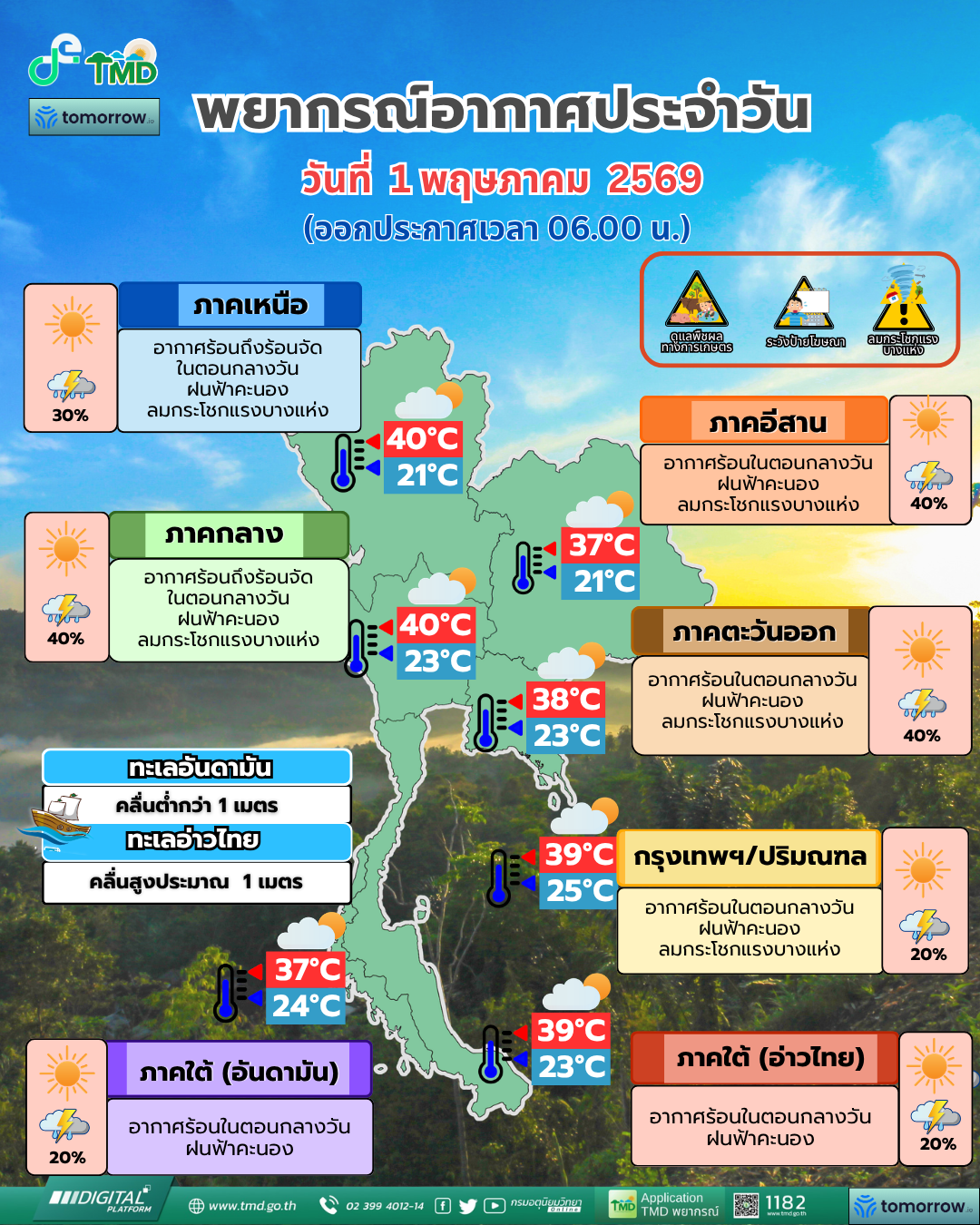 1 พ.ค. 2569 – กรมอุตุนิยมวิทยา พยากรณ์อากาศ 24 ชั่วโมงข้างหน้า ประเทศไทยตอนบนยังคงมีพายุฤดูร้อนเกิดขึ้น โดยมีลักษณะของฝนฟ้าคะนอง กับลมกระโชกแรงบางแห่ง รวมถึงอาจมีฟ้าผ่า เกิดขึ้นได้บางพื้นที่ เนื่องจากบริเวณความกดอากาศสูงหรือมวลอากาศเย็นจากประเทศจีนยังคงปกคลุมภาคตะวันออกเฉียงเหนือ และทะเลจีนใต้ ในขณะที่ประเทศไทยตอนบนมีอากาศร้อนถึงร้อนจัด ขอให้ประชาชนระวังอันตรายจากพายุฤดูร้อน โดยหลีกเลี่ยงการอยู่ในที่โล่งแจ้ง ใต้ต้นไม้ใหญ่ สิ่งปลูกสร้าง และป้ายโฆษณาที่ไม่แข็งแรง สำหรับเกษตรกรควรเสริมความแข็งแรงให้ไม้ผล และเตรียมการป้องกันความเสียหายที่อาจเกิดขึ้นกับผลผลิตทางการเกษตรและสัตว์เลี้ยง รวมทั้งดูแลรักษาสุขภาพในช่วงที่สภาพอากาศเปลี่ยนแปลงไว้ด้วย
