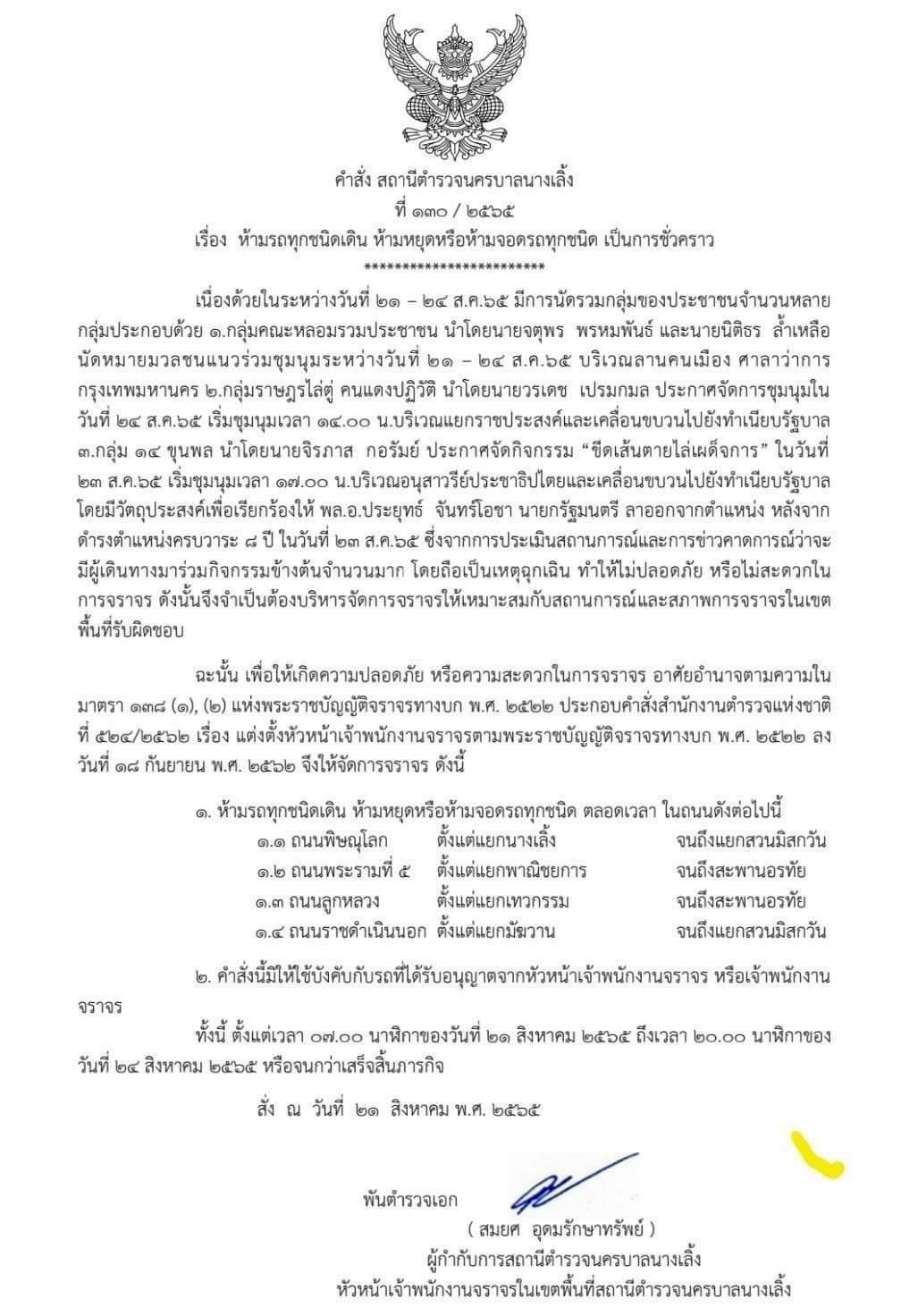 23 ส.ค.2565 - พันตำรวจเอก สมยศ อุดมรักษาทรัพย์ ผู้กำกับการสถานีตำรวจนครบาลนางเลิ้ง ในฐานะหัวหน้าเจ้าพนักงานจราจรในเขตพื้นที่สถานีตำรวจนครบาลนางเลิ้ง ลงนามในคำสั่ง สถานีตำรวจนครบาลนางเลิ้งที่ 130/2565 เรื่อง ห้ามรถทุกชนิดเดิน ห้ามหยุดหรือห้ามจอดรถทุกชนิด เป็นการชั่วคราว