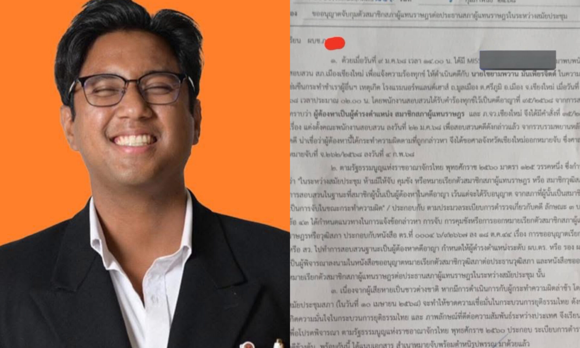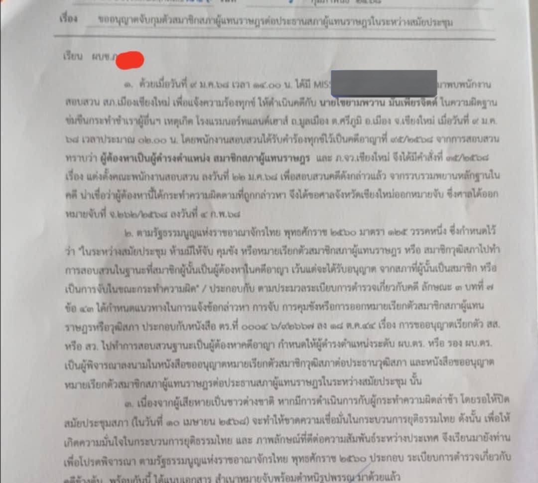 7 ก.พ. 2568 - ผู้สื่อข่าวรายงานว่า สภ.เชียงใหม่ ทำหนังสือถึงสภาผู้แทนราษฎร เพื่อขออนุญาตจับตัวนายไชยามพวาน มั่นเพียรตจิตต์ หรือ “ปูอัด” สส.กรุงเทพฯ พรรคไทยก้าวหน้า ภายหลังศาลจังหวัดเชียงใหม่อนุมัติหมายจับในคดีข่มขืนกระทำชำเรานักท่องเที่ยวสาว ชาวไต้หวัน