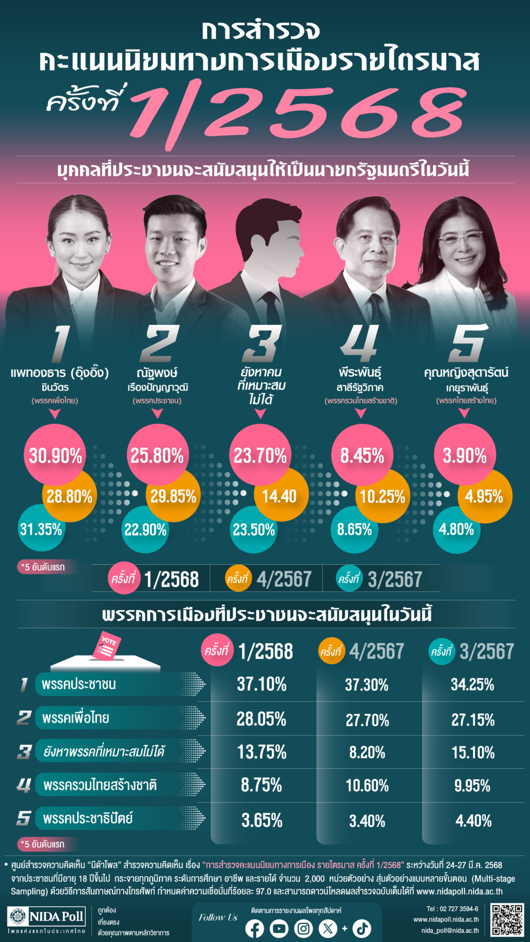 30 มี.ค. 2568 – ศูนย์สำรวจความคิดเห็น “นิด้าโพล” สถาบันบัณฑิตพัฒนบริหารศาสตร์ (นิด้า) เปิดเผยผลการสำรวจ เรื่อง “การสำรวจคะแนนนิยมทางการเมืองรายไตรมาส ครั้งที่ 1/2568” ทำการสำรวจระหว่างวันที่ 24-27 มีนาคม 2568 จากประชาชนที่มีอายุ 18 ปีขึ้นไป กระจายทุกภูมิภาค ระดับการศึกษา อาชีพ และรายได้ ทั่วประเทศ รวมจำนวนทั้งสิ้น 2,000 หน่วยตัวอย่าง เกี่ยวกับคะแนนนิยมทางการเมือง การสำรวจอาศัยการสุ่มตัวอย่างโดยใช้ความน่าจะเป็นจากบัญชีรายชื่อฐานข้อมูลตัวอย่างหลัก (Master Sample) ของ “นิด้าโพล” สุ่มตัวอย่างแบบหลายขั้นตอน (Multi-stage Sampling) เก็บข้อมูลด้วยวิธีการสัมภาษณ์ทางโทรศัพท์ โดยกำหนดค่าความเชื่อมั่น ร้อยละ 97.0