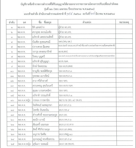 ผู้สื่อข่าวรายงานว่า บัญชีรายชื่อข้าราชการตำรวจที่ได้รับอนุญาตให้ลาออกจากราชการตามตามโครงการปรับเปลี่ยนกำลังพล รุ่นที่ 26 (รอบเม.ย.ปีงบประมาณ พ.ศ.2568) มีจำนวน 25 ราย ประกอบด้วย พล.ต.ท.ธิติ แสงสว่าง ผู้ช่วย ผบ.ตร.,พล.ต.ท.สรายุทธ สงวนโภคัย ผู้ช่วย ผบ.ตร.,พล.ต.ท.อภิชาติ เพชรประสิทธิ์ ผู้ช่วย ผบ.ตร.,พล.ต.ท.บัณฑิต ตุงคะเศรณี จตร.,พล.ต.ท.ปราบพาล มีมงคล ผบช.ประจำ สง.ผบ.ตร.,พล.ต.ท.วราวุธ สกลธนารักษ์ ผบช.สงป.,พล.ต.ท.วีรชน บุญทวี ผบช.ประจำ สง.ผบ.ตร.,พล.ต.ท.อภิชาติ สุริบุญญา ผบช.กมค.,