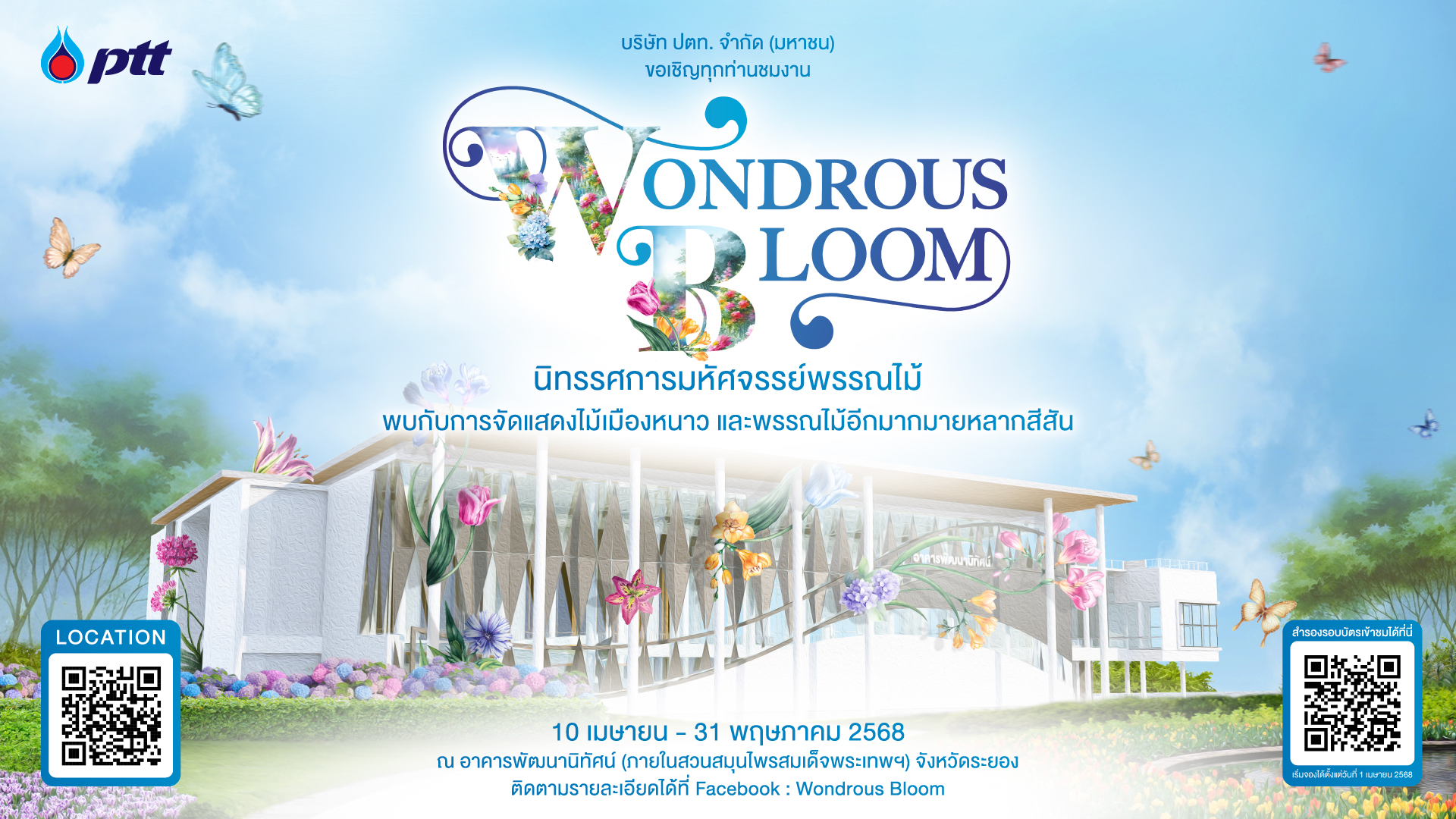 “นิทรรศการ Wondrous Bloom” จัดขึ้นที่ อาคารพัฒนานิทัศน์ สวนสมุนไพรสมเด็จพระเทพฯ จ.ระยอง ตั้งอยู่บน ถนนทางหลวงระยอง 3191 ตำบลมาบข่า อำเภอนิคมพัฒนา จ.ระยอง เปิดให้เข้า ชมตั้งแต่วันนี้ถึง 31 พฤษภาคม 2568 ทุกวันอังคาร - อาทิตย์ เวลา 10:00 - 20:00 น. (ปิดทุกวันจันทร์) ‘ไม่มีการเก็บค่าเข้าชม’ สามารถติดตามรายละเอียดและสอบถามข้อมูลเพิ่มเติมได้ที่ Facebook Page : wondrousbloom Intagram: ptt_wondrousbloom