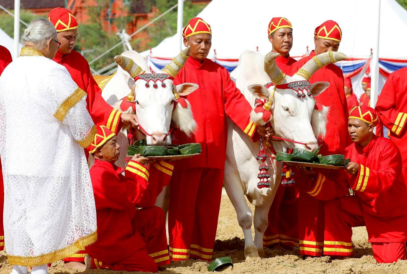 การนี้ พระยาแรกนาหยิบเสี่ยงทายผ้านุ่ง 5 คืบ พยากรณ์ว่า น้ำจะมีปริมาณพอดี ข้าวกล้าในนา จะได้ผลบริบูรณ์ และผลาหาร มังสาหาร จะอุดมสมบูรณ์ดี การเสี่ยงทายพระโคกินเลี้ยง พระโคกินน้ำ หญ้า พยากรณ์ว่า น้ำท่าจะบริบูรณ์พอควร ธัญญาหาร ผลาหาร ภักษาหาร มังสาหาร จะอุดมสมบูรณ์ดี และพระโค กินเหล้า พยากรณ์ว่า การคมนาคมสะดวกยิ่งขึ้น การค้าขายกับต่างประเทศดีขึ้น ทำให้เศรษฐกิจเจริญรุ่งเรือง