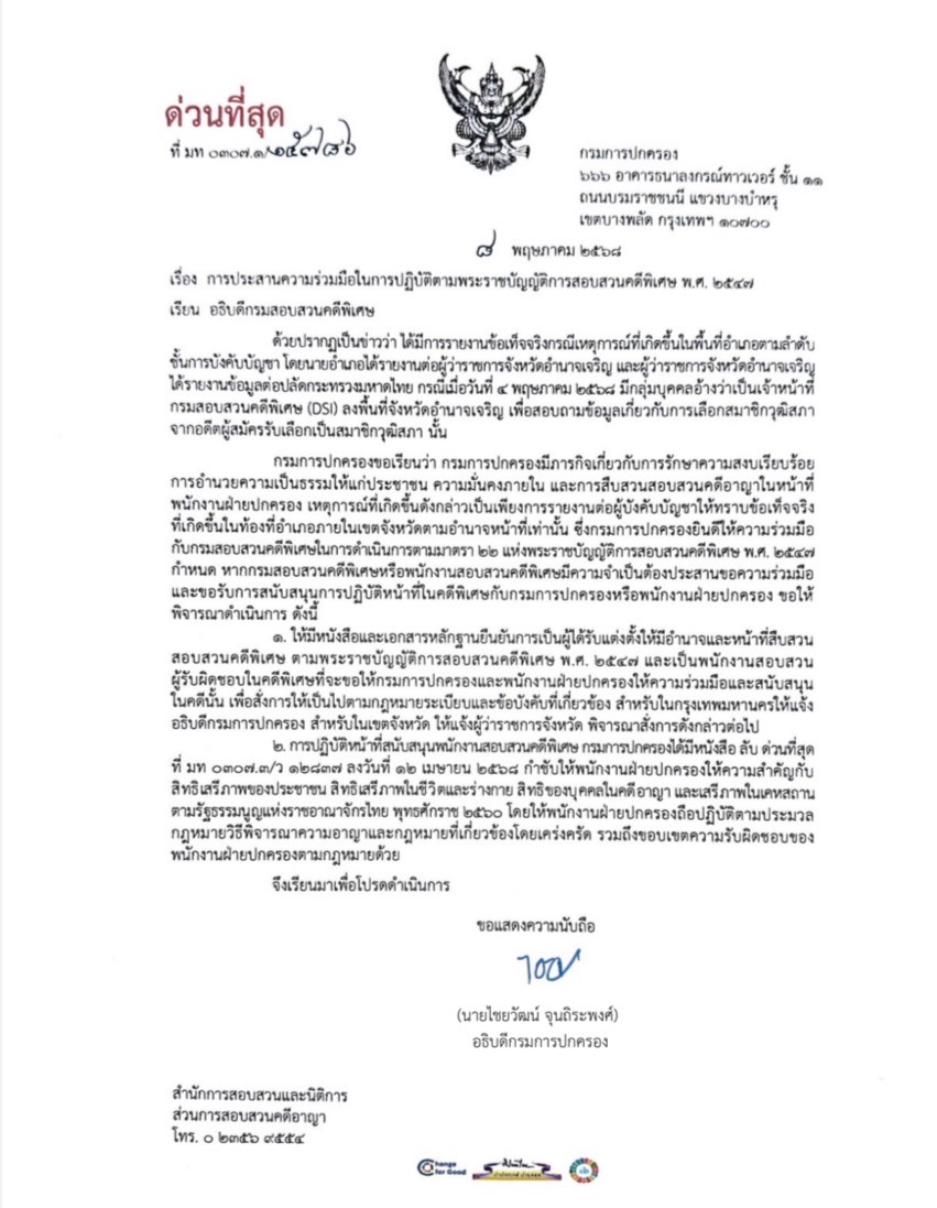 9 พฤษภาคม 2568 - ผู้สื่อข่าวรายงานว่า เมื่อวันที่ 8 พ.ค. นายไชยวัฒน์ จุนถิระพงศ์ อธิบดีกรมการปกครอง ทำหนังสือด่วนที่สุด ที่มท0307.1/25786 ถึง อธิบดีกรมสอบสวนคดีพิเศษ เรื่อง การประสานความร่วมมือในการปฏิบัติตามพระราชบัญญัติการสอบสวนคดีพิเศษ พ.ศ. 2547