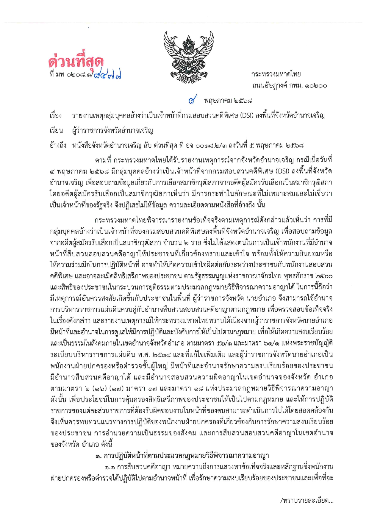 ด้วยปรากฏเป็นข่าวว่า ผู้ว่าราชการจังหวัดอำนาจเจริญได้รายงานข้อมูลต่อปลัดกระทรวงมหาดไทย กรณีเมื่อวันที่ 4 พฤษภาคม มีกลุ่มบุคคลอ้างว่าเป็นเจ้าหน้าที่กรมสอบสวนคดีพิเศษ (DSI) ลงพื้นที่จังหวัดอำนาจเจริญ เพื่อสอบถามข้อมูลเกี่ยวกับการเลือกสมาชิกวุฒิสภา จากอดีตผู้สมัครรับเลือกเป็นสมาชิกวุฒิสภา นั้น