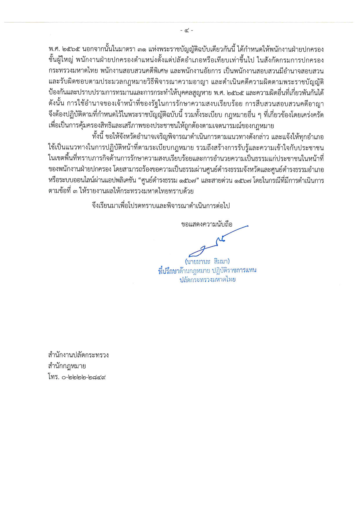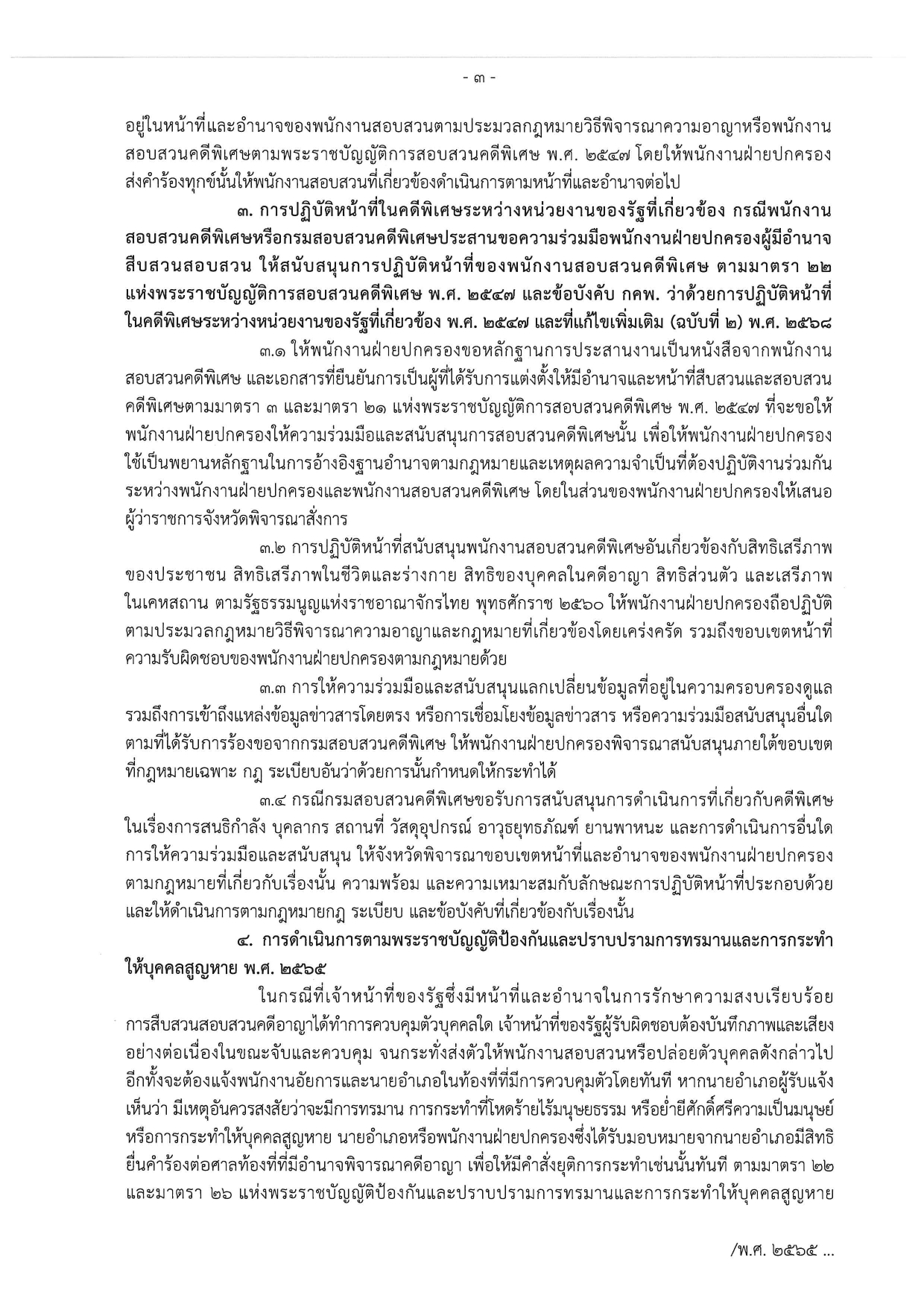2. การปฏิบัติหน้าที่สนับสนุนพนักงานสอบสวนคดีพิเศษ กรมการปกครองได้มีหนังสือลับด่วนที่สุดที่ มท 0307.3/ว 12837 ลงวันที่ 12 เมษายน 2568 กำชับให้พนักงานฝ่ายปกครองให้ความสำคัญกับสิทธิเสรีภาพของประชาชน สิทธิเสรีภาพในชีวิตและร่างกาย สิทธิของบุคคลในคดีอาญา และเสรีภาพในเคหสถานตามรัฐธรรมนูญแห่งราชอาณาจักรไทย โดยให้พนักงานฝ่ายปกครองถือปฏิบัติตามประมวลกฎหมายวิธีพิจารณาความอาญาและกฎหมายที่เกี่ยวข้องโดยเคร่งครัด รวมถึงขอบเขตความรับผิดชอบของ