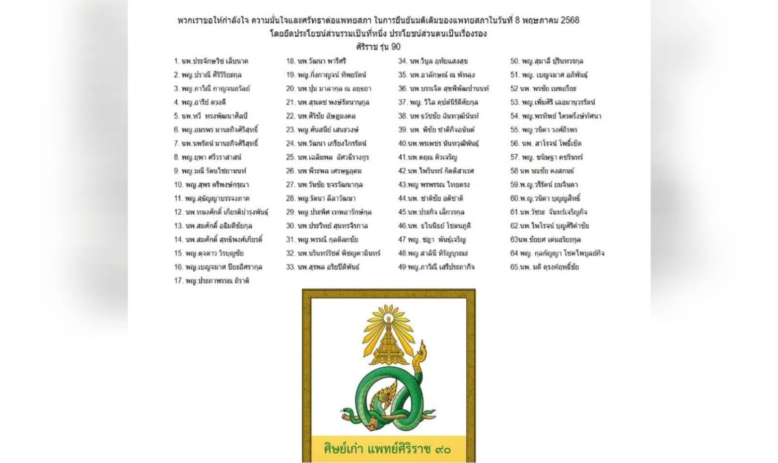 พวกเราขอให้กำลังใจ ความมั่นใจและศรัทธาต่อแพทยสภา ในการยืนยันมติเดิมของแพทยสภาในวันที่ 8 พฤษภาคม 2568 โดยยึดประโยชน์ส่วนรวมเป็นที่หนึ่ง ประโยชน์ส่วนตนเป็นเรื่องรอง