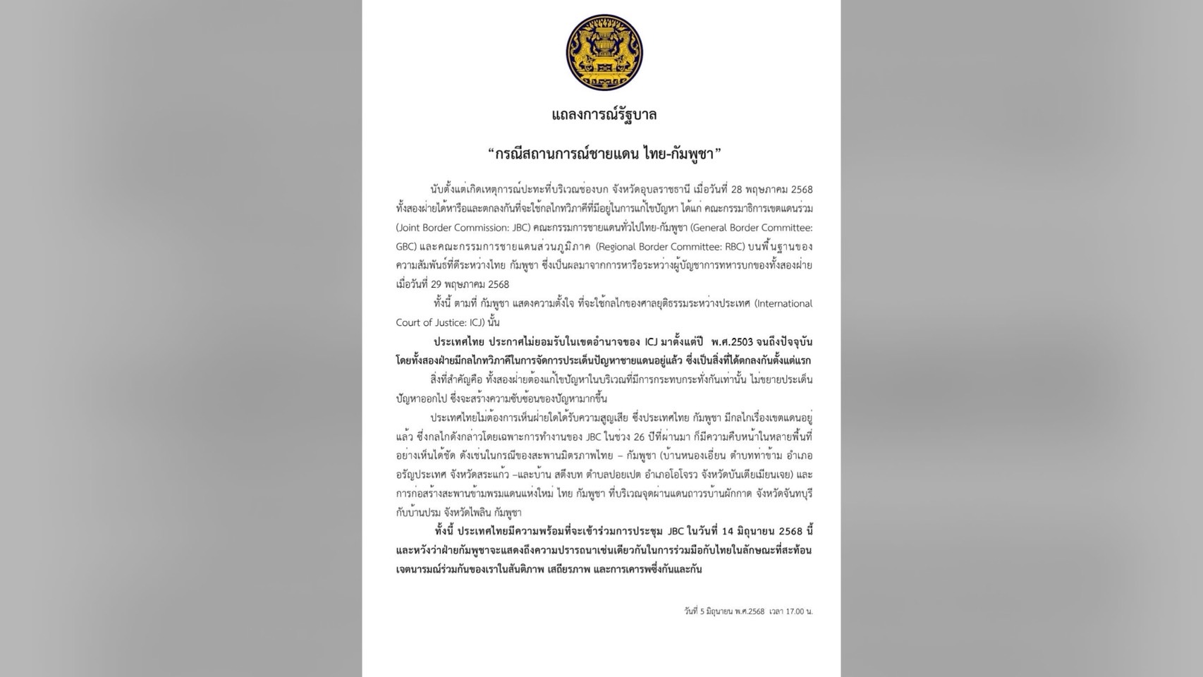 ประเทศไทยมีความพร้อมที่จะเข้าร่วมการประชุม JBC ในวันที่ 14 มิถุนายน 2568 และหวังว่าฝ่ายกัมพูชาจะแสดงถึงความปรารถนาเช่นเดียวกันในการร่วมมือกับไทยในลักษณะที่สะท้อนเจตนารมณ์ร่วมกันของเราในสันติภาพ เสถียรภาพ และการเคารพซึ่งกันและกัน