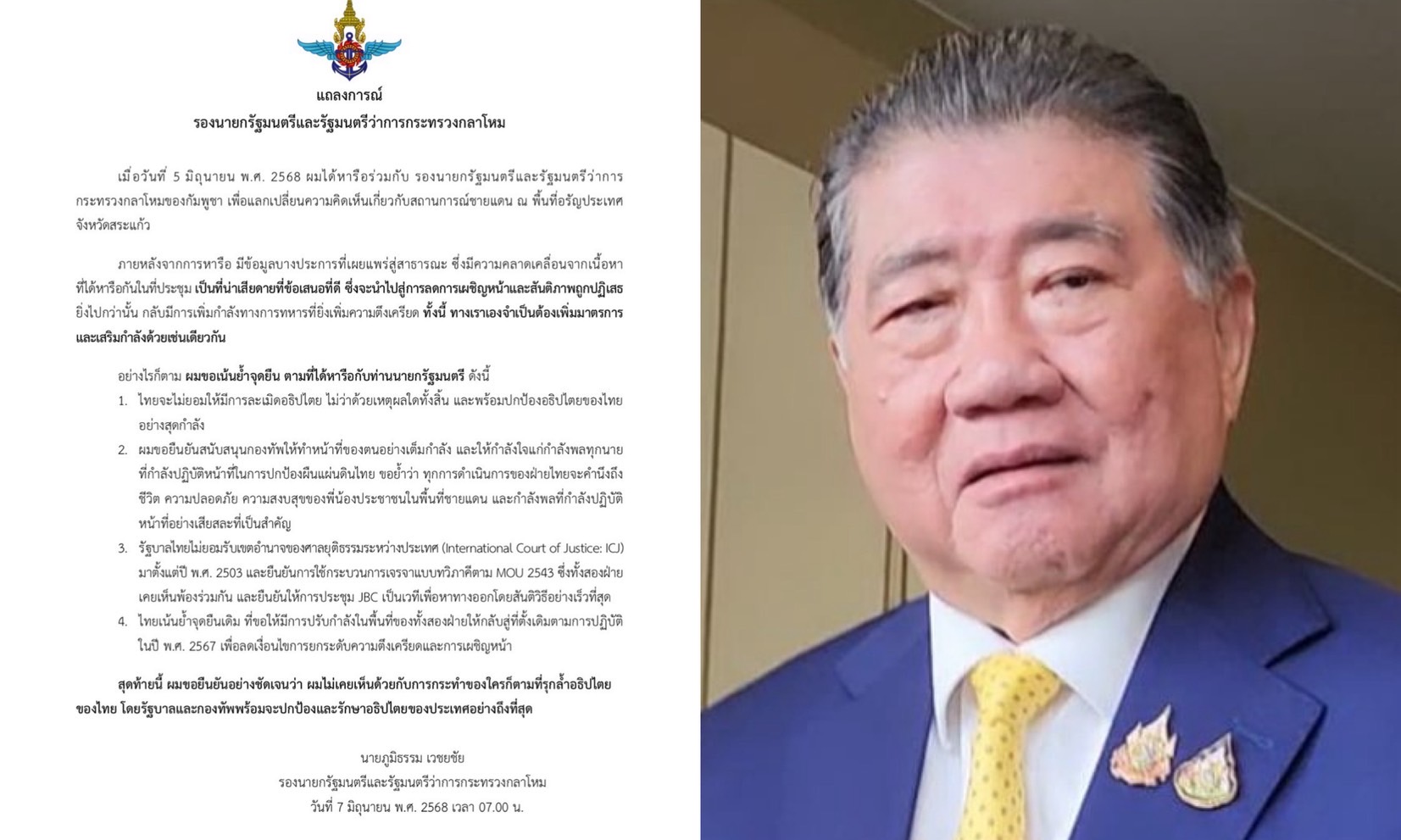 “รองนายกฯ–กลาโหม” เปลี่ยนลุคโหมดเข้ม ร่อนแถลงการณ์ย้ำ 4 จุดยืนกร้าว หลังคุยกัมพูชาที่อรัญฯ ชี้ข้อเสนอเพื่อสันติภาพถูกปฏิเสธ ซ้ำยังเพิ่มกำลังทหาร ไทยจำเป็นต้องตอบโต้ ดัน JBC เจรจาทวิภาคี ย้ำไม่รับเขตอำนาจศาลโลก