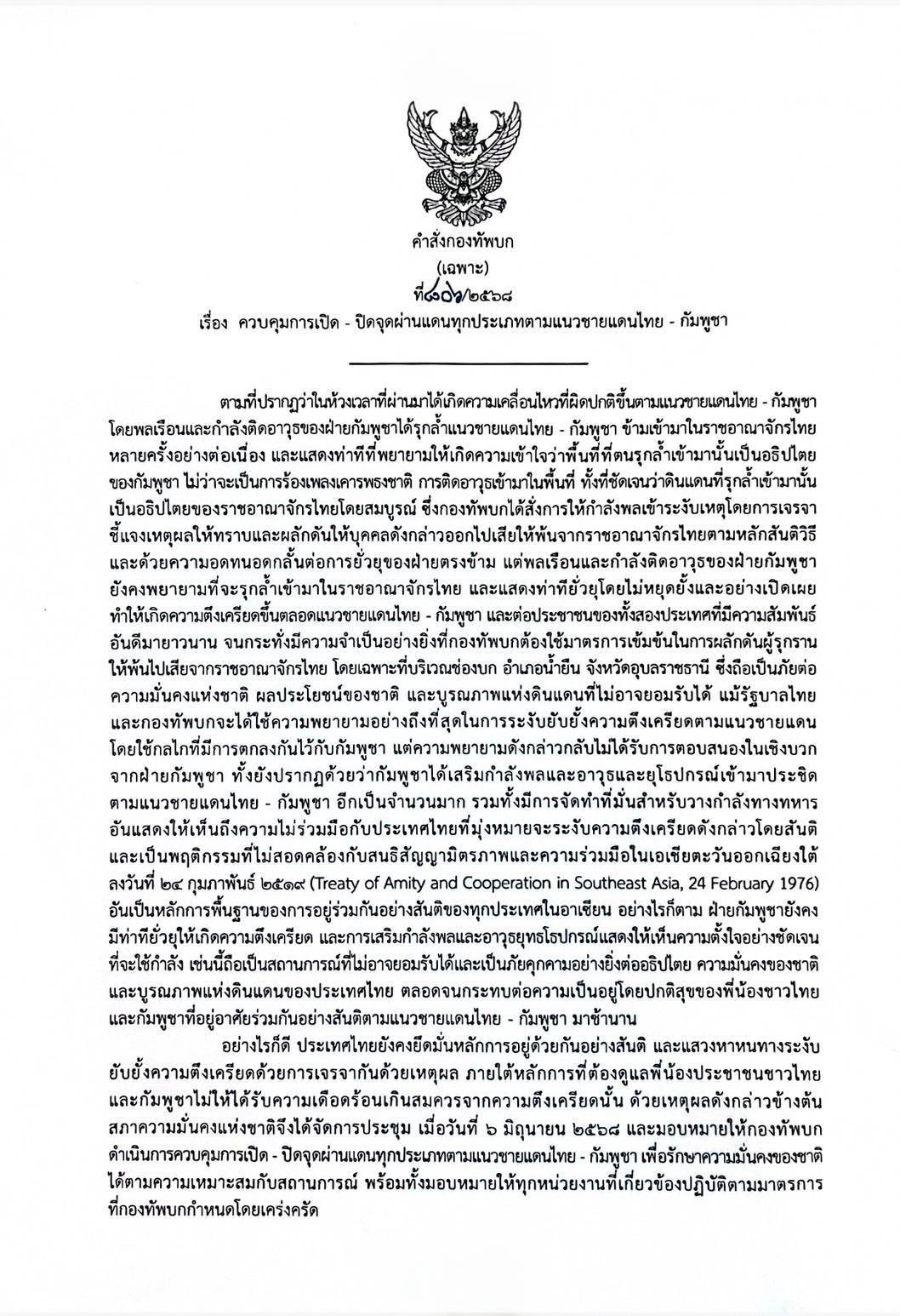 หลังฝ่ายกัมพูชายั่วยุรุกล้ำแดน–เสริมกำลังไม่หยุด กองทัพบกเคลื่อนไหวเด็ดขาด มอบอำนาจภาคสนามควบคุมการเปิด–ปิดจุดผ่านแดนตามสถานการณ์ หวังรักษาเสถียรภาพ-คุ้มครองอธิปไตยไทย