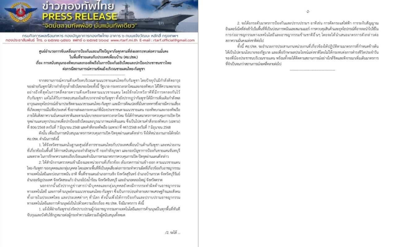 8 มิ.ย.2568-กองทัพไทยเผยแพร่เอกสารข่าว ศูนย์อำนวยการขับเคลื่อนการป้องกันและแก้ไขปัญหาภัยคุกคามที่ส่งผลกระทบต่อความมั่นคง ในพื้นที่ชายแดนกับประเทศเพื่อนบ้าน (ศอ.ปชด.) มีคำสั่ง เรื่องการสนับสนุนกองทัพบกและกองทัพเรือในการป้องกันอธิปไตยและปกป้องประชาชนชาวไทย ต่อกรณีสถานการณ์ความขัดแย้งบริเวณชายแดนไทย-กัมพูชา