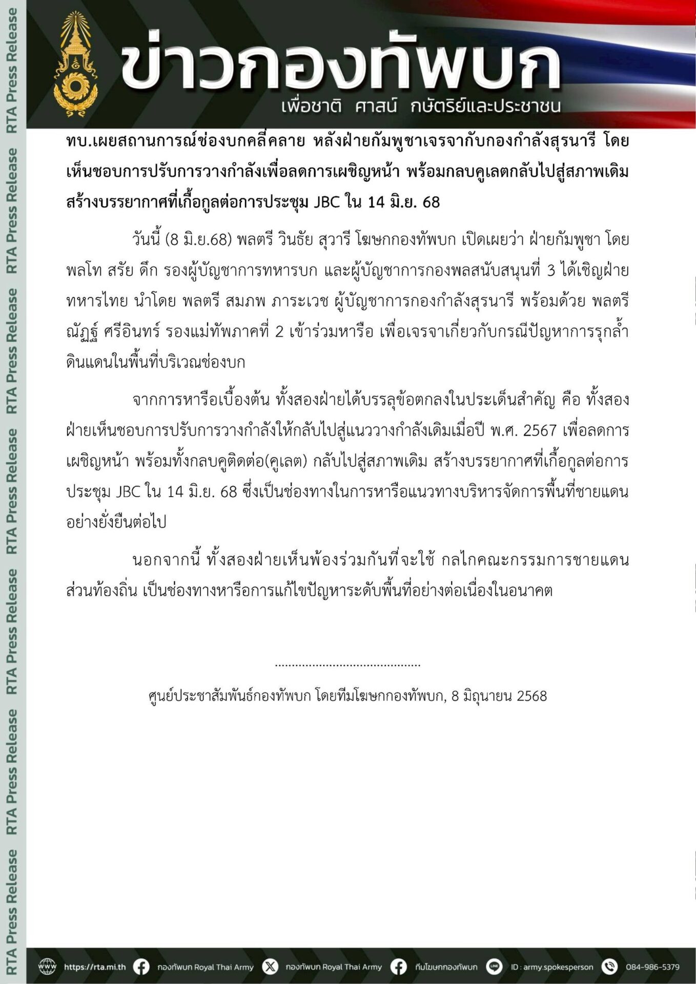 9 มิ.ย.2568-เอกสารข่าวกองทัพบก เผยแพร่คำสัมภาษณ์ พลตรีวินธัย สุวารี โฆษกกองทัพบก เปิดเผยว่า ฝ่ายกัมพูชา โดย พลโท สรัย ดึก รองผู้บัญชาการทหารบก และผู้บัญชาการกองพลสนับสนุนที่ 3 ได้เชิญฝ่ายทหารไทย นำโดย พลตรี สมภพ ภาระเวช ผู้บัญชาการกองกำลังสุรนารี พร้อมด้วย พลตรี ณัฏฐ์ ศรีอินทร์ รองแม่ทัพภาคที่ 2 เข้าร่วมหารือ เพื่อเจรจาเกี่ยวกับกรณีปัญหาการรุกล้ำดินแดนในพื้นที่บริเวณช่องบก
