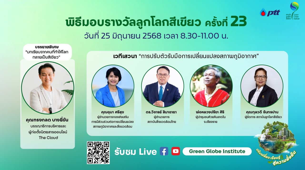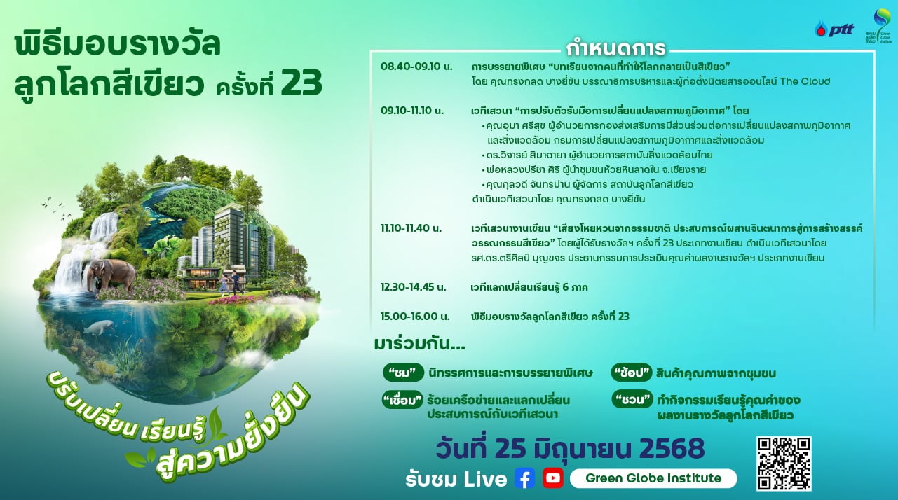 ในปีนี้กิจกรรม จะถูกจัดขึ้นในวันพุธที่ 25 มิถุนายน 2568 เวลา 8.00-17.00 น. ณ ปตท. สำนักงานใหญ่ (กำหนดการดังแนบ) โดยผู้ที่สนใจสามารถรับชมสด และย้อนหลังผ่านช่องทาง : Facebook Live ตลอดทั้งงาน และ YouTube : Green globe Institute โดย Theme การจัดงานปี 2568 ได้แก่ “ปรับเปลี่ยน เรียนรู้ สู่ความยั่งยืน”สภาพภูมิอากาศที่เปลี่ยนแปลงอย่างรวดเร็วและรุนแรงขึ้นส่งผลกระทบต่อชุมชนต่างๆ ทั่วประเทศ ไม่เว้นแม้กระทั่งชุมชนที่เคยได้รับรางวัลลูกโลกสีเขียว ซึ่งมีความเข้มแข็งทั้งจากภายใน และมีพันธมิตรภายนอกที่แข็งแกร่ง การ “ปรับเปลี่ยน” วิธีคิด วิถีชีวิต “เรียนรู้” และเปิดรับองค์ความรู้ที่หลากหลาย ผสมผสานทั้งวิทยาศาสตร์และภูมิปัญญาท้องถิ่น จะสนับสนุนให้ชุมชนสามารถจัดการทรัพยากรธรรมชาติซึ่งเป็นสิ่งสำคัญต่อชีวิตได้อย่าง “ยั่งยืน”