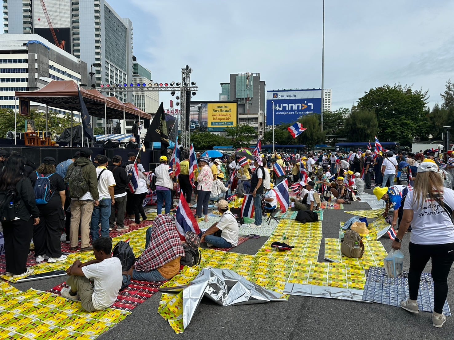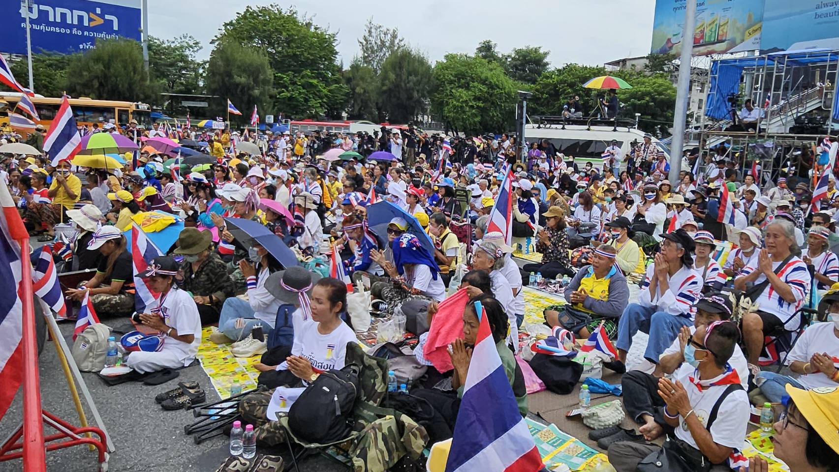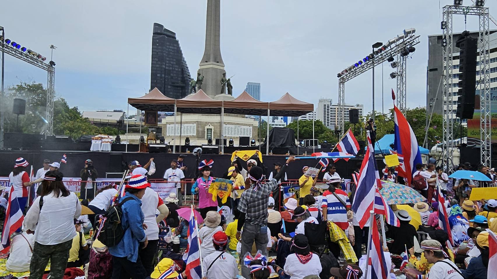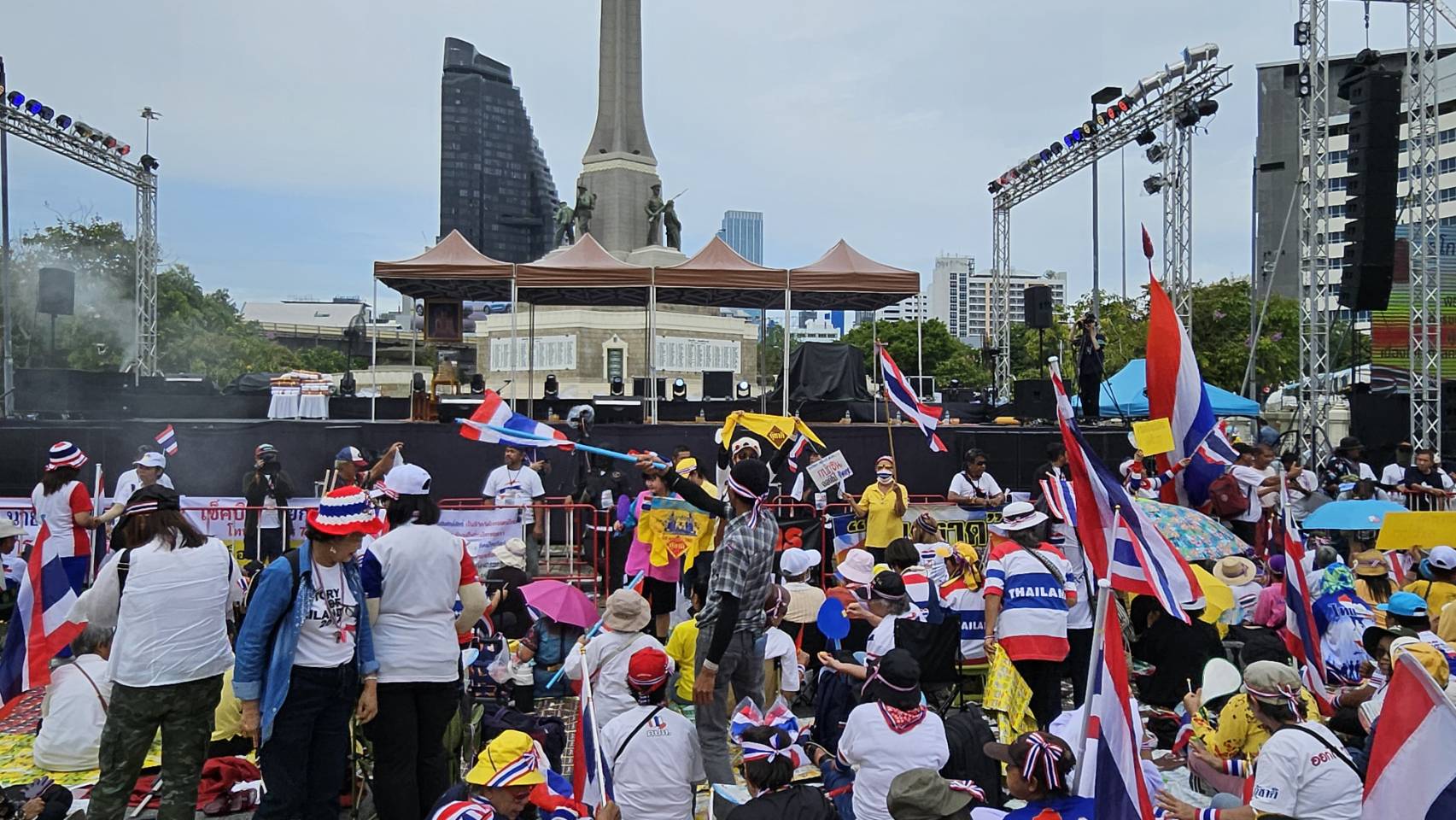 กลุ่มรวมพลังแผ่นดินปกป้องอธิปไตยทยอยจับจองพื้นที่อนุสาวรีย์ชัยฯ ตั้งแต่เช้า ผู้ชุมนุมโบกธงชาติ-ชูป้ายปกป้องอธิปไตย เตรียมเวทีบวงสรวง-ปราศรัยใหญ่ตลอดวันนี้