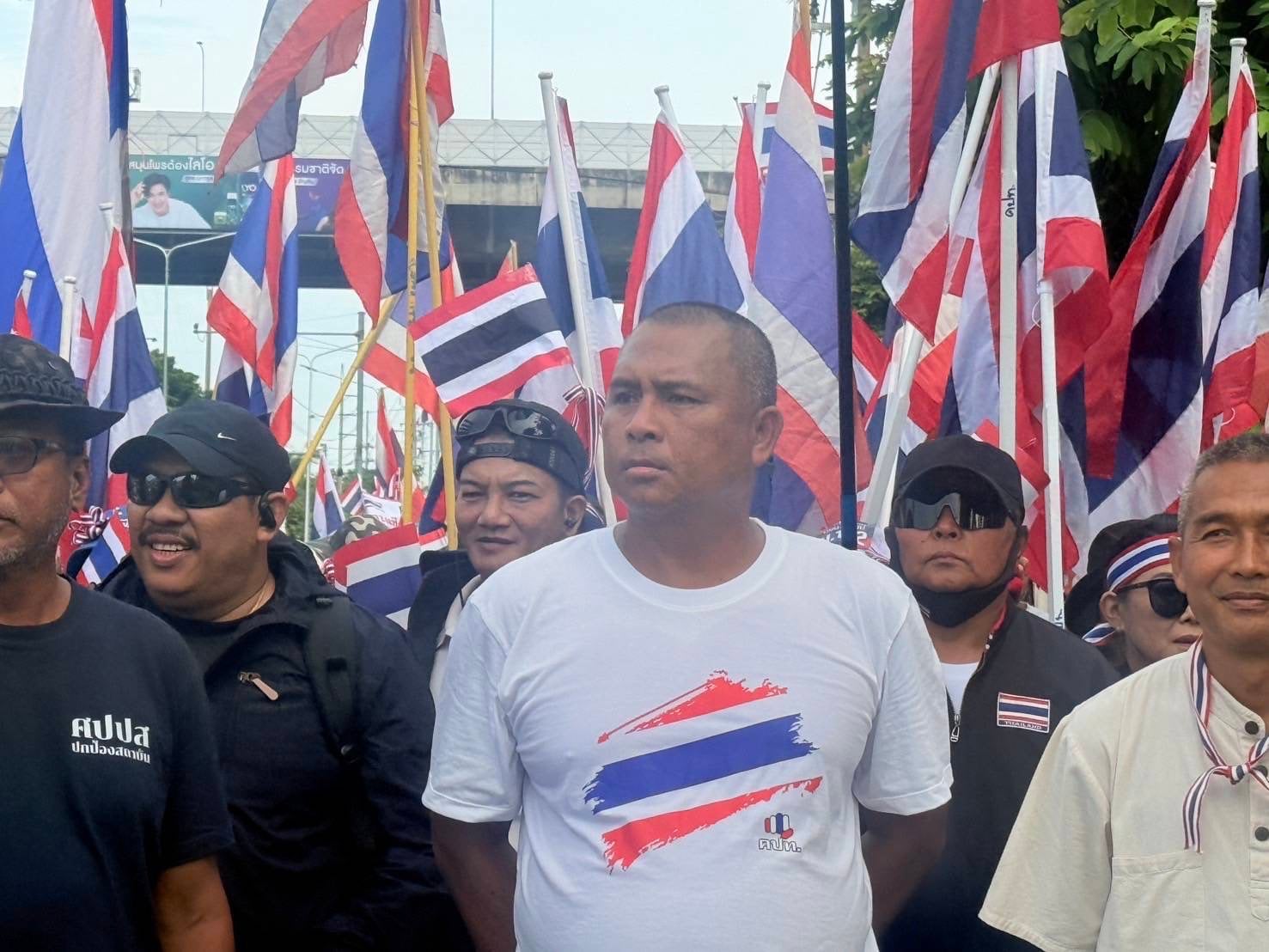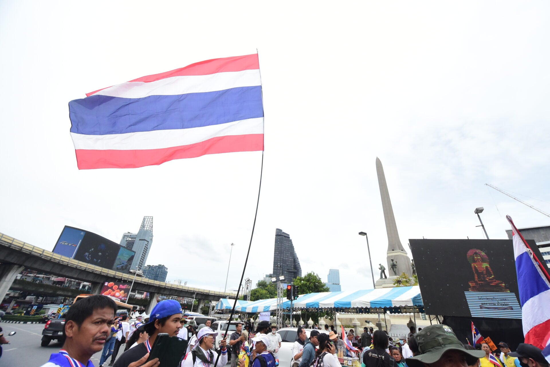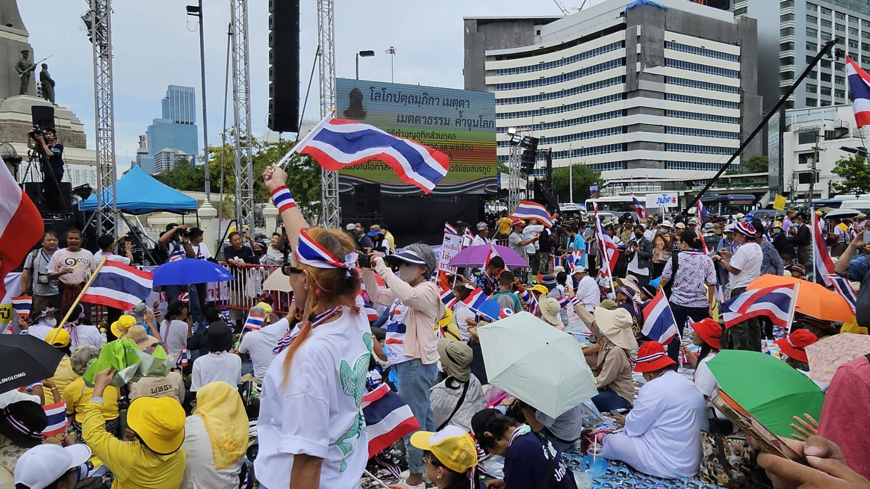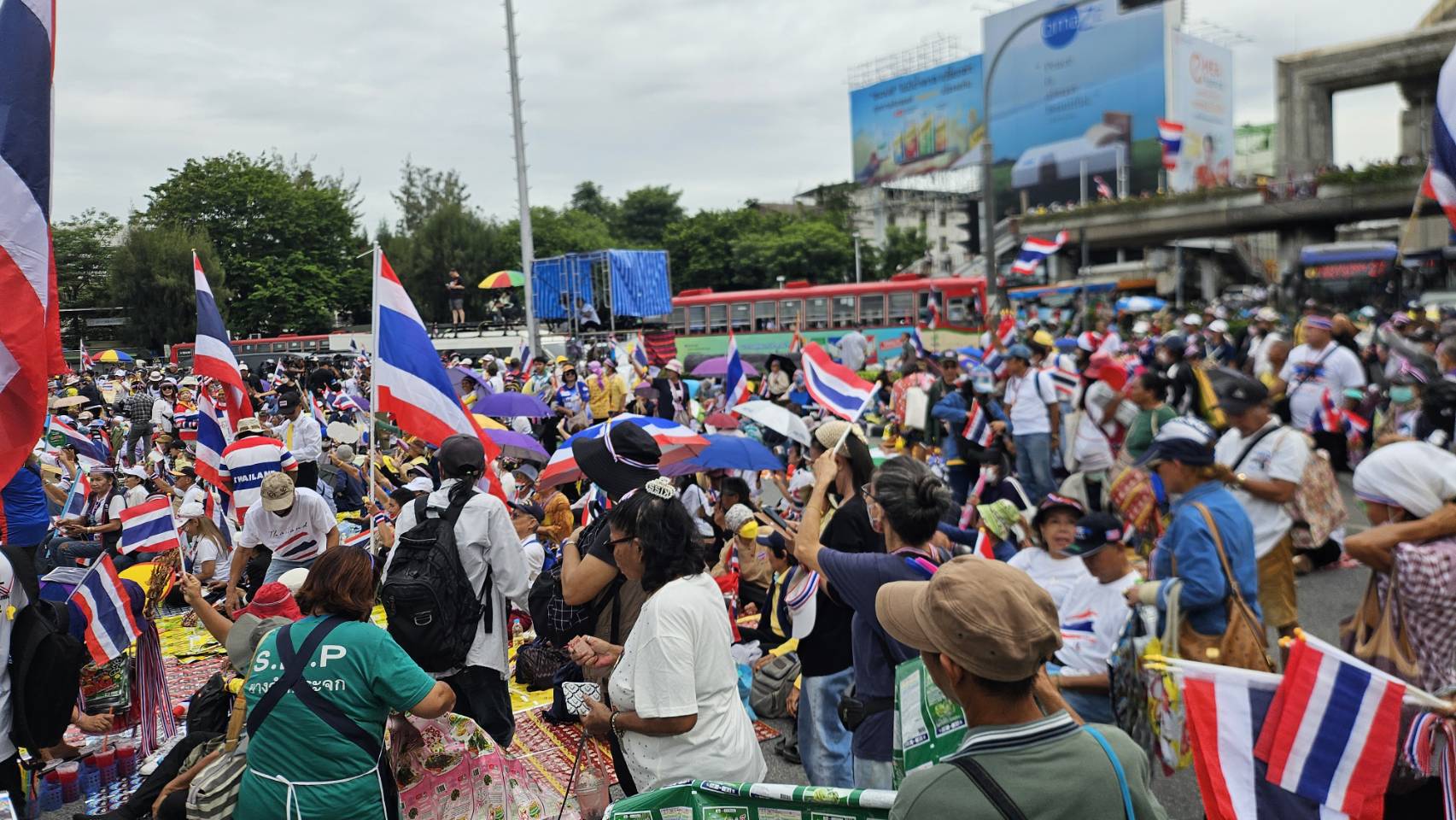 กลุ่มรวมพลังแผ่นดินปกป้องอธิปไตยทยอยจับจองพื้นที่อนุสาวรีย์ชัยฯ ตั้งแต่เช้า ผู้ชุมนุมโบกธงชาติ-ชูป้ายปกป้องอธิปไตย เตรียมเวทีบวงสรวง-ปราศรัยใหญ่ตลอดวันนี้