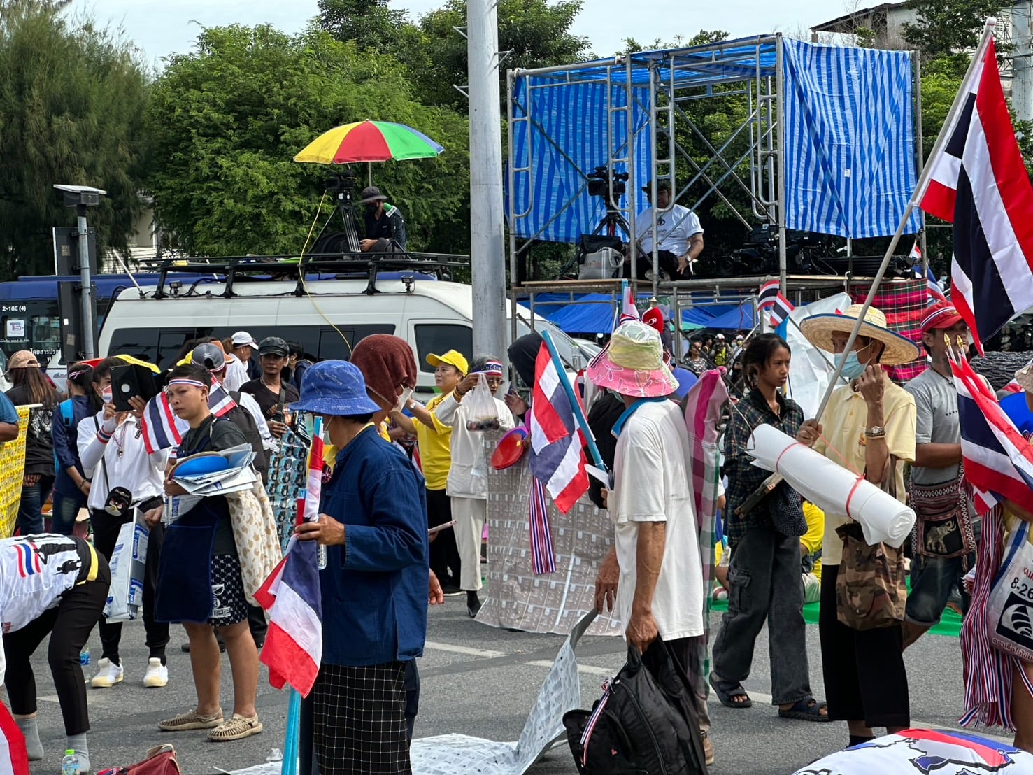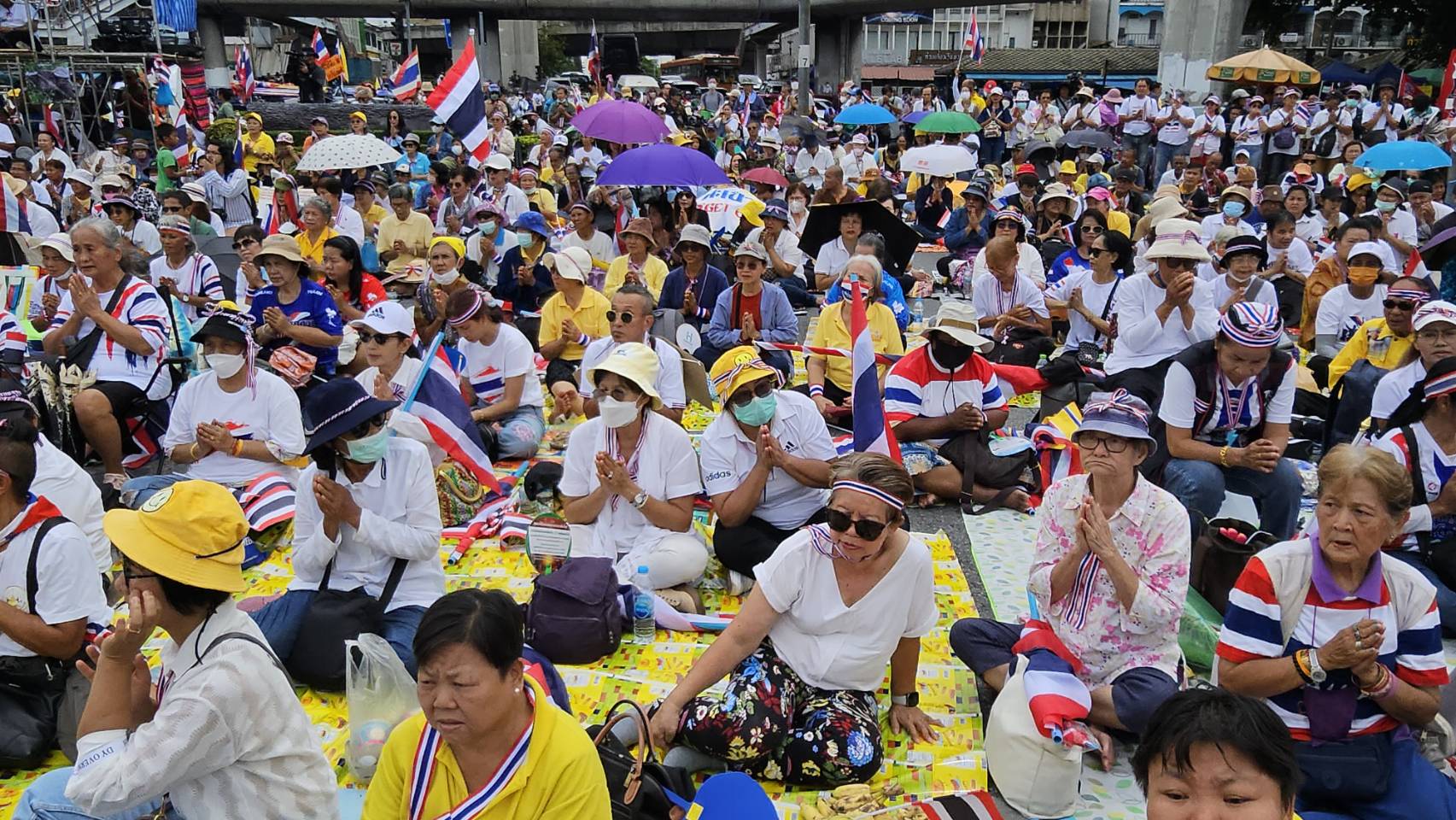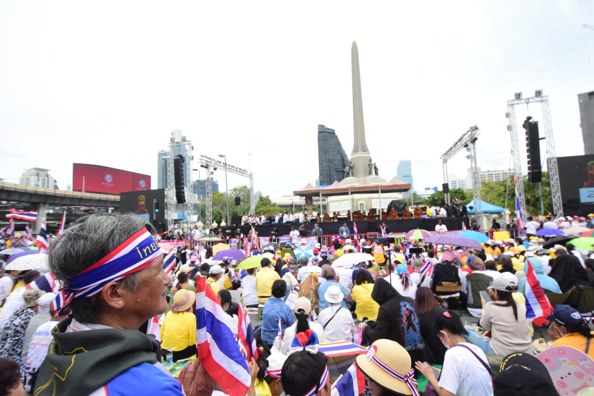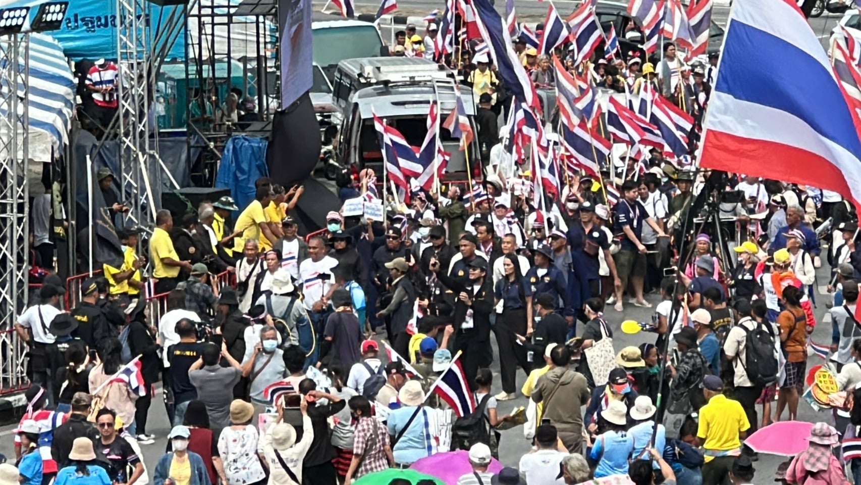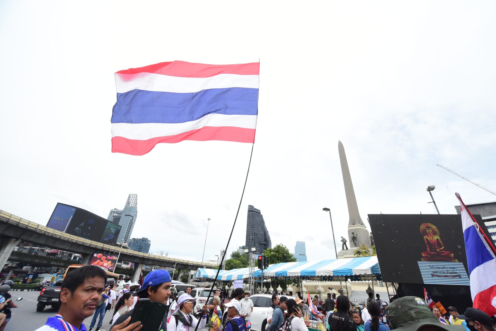 กลุ่มรวมพลังแผ่นดินปกป้องอธิปไตยทยอยจับจองพื้นที่อนุสาวรีย์ชัยฯ ตั้งแต่เช้า ผู้ชุมนุมโบกธงชาติ-ชูป้ายปกป้องอธิปไตย เตรียมเวทีบวงสรวง-ปราศรัยใหญ่ตลอดวันนี้