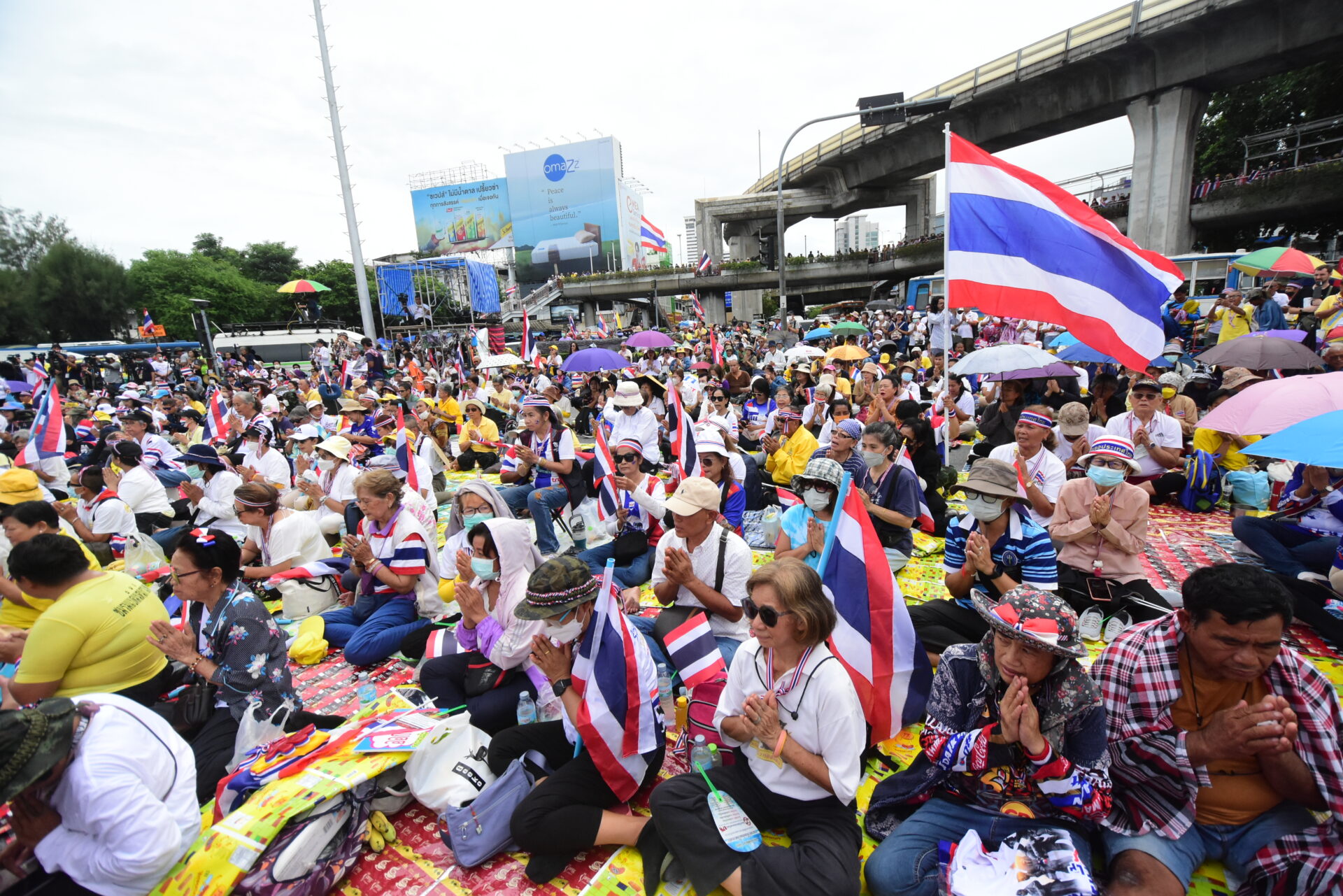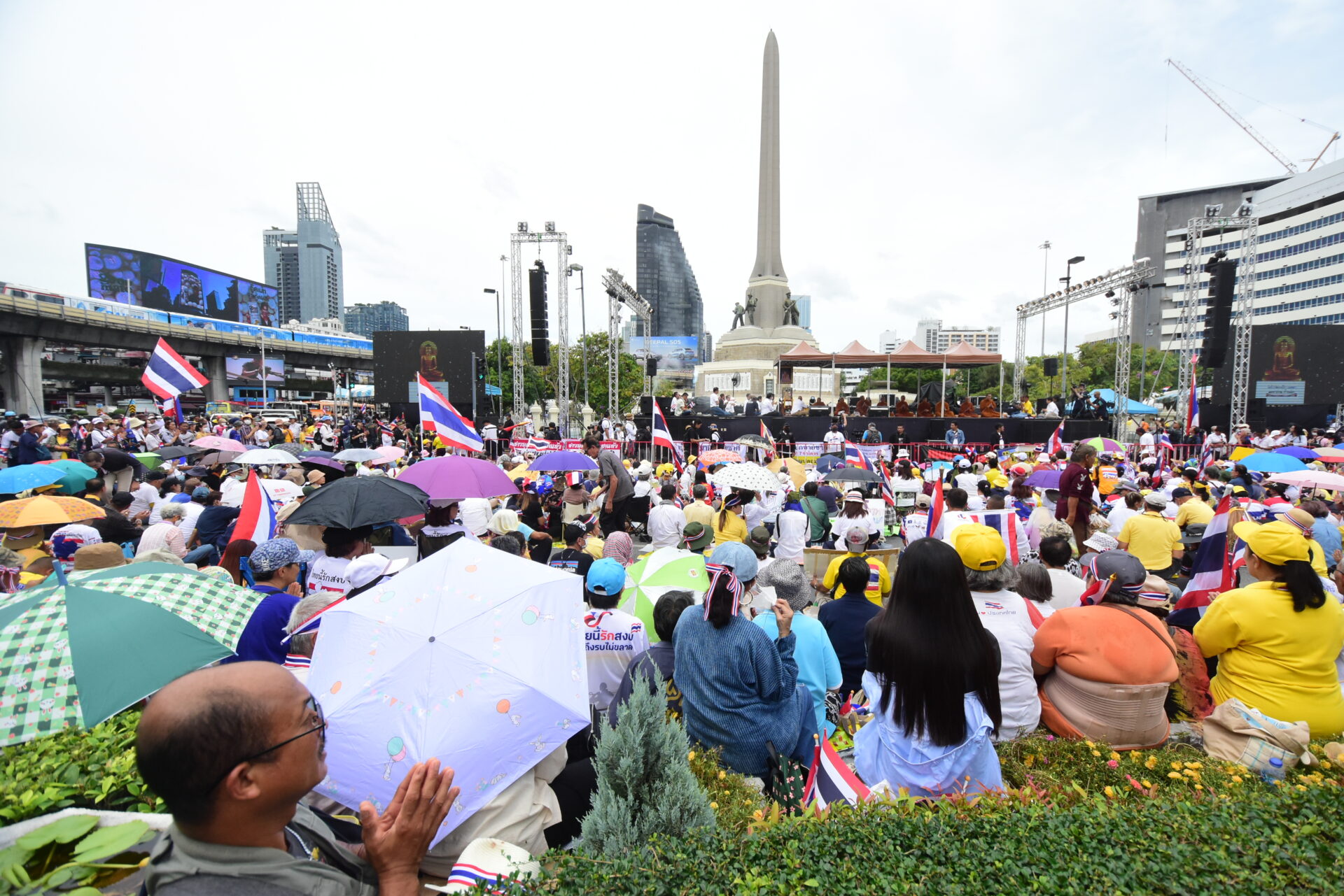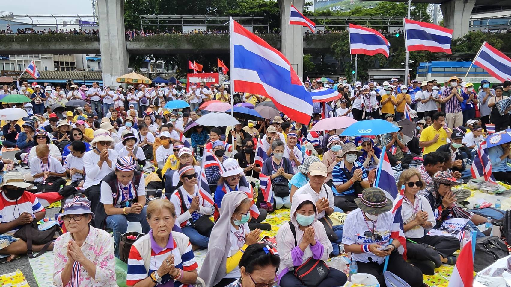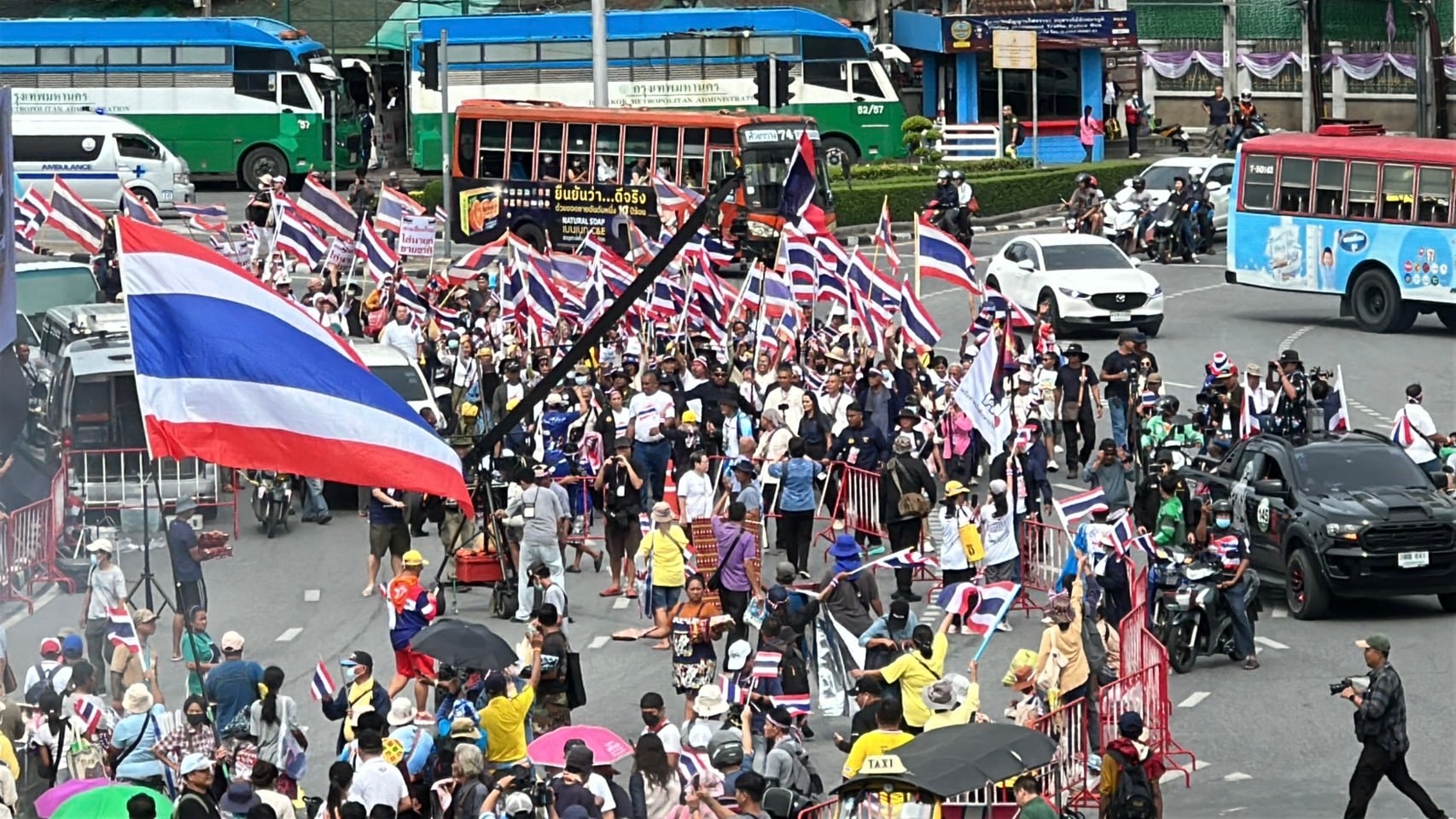 กลุ่มรวมพลังแผ่นดินปกป้องอธิปไตยทยอยจับจองพื้นที่อนุสาวรีย์ชัยฯ ตั้งแต่เช้า ผู้ชุมนุมโบกธงชาติ-ชูป้ายปกป้องอธิปไตย เตรียมเวทีบวงสรวง-ปราศรัยใหญ่ตลอดวันนี้