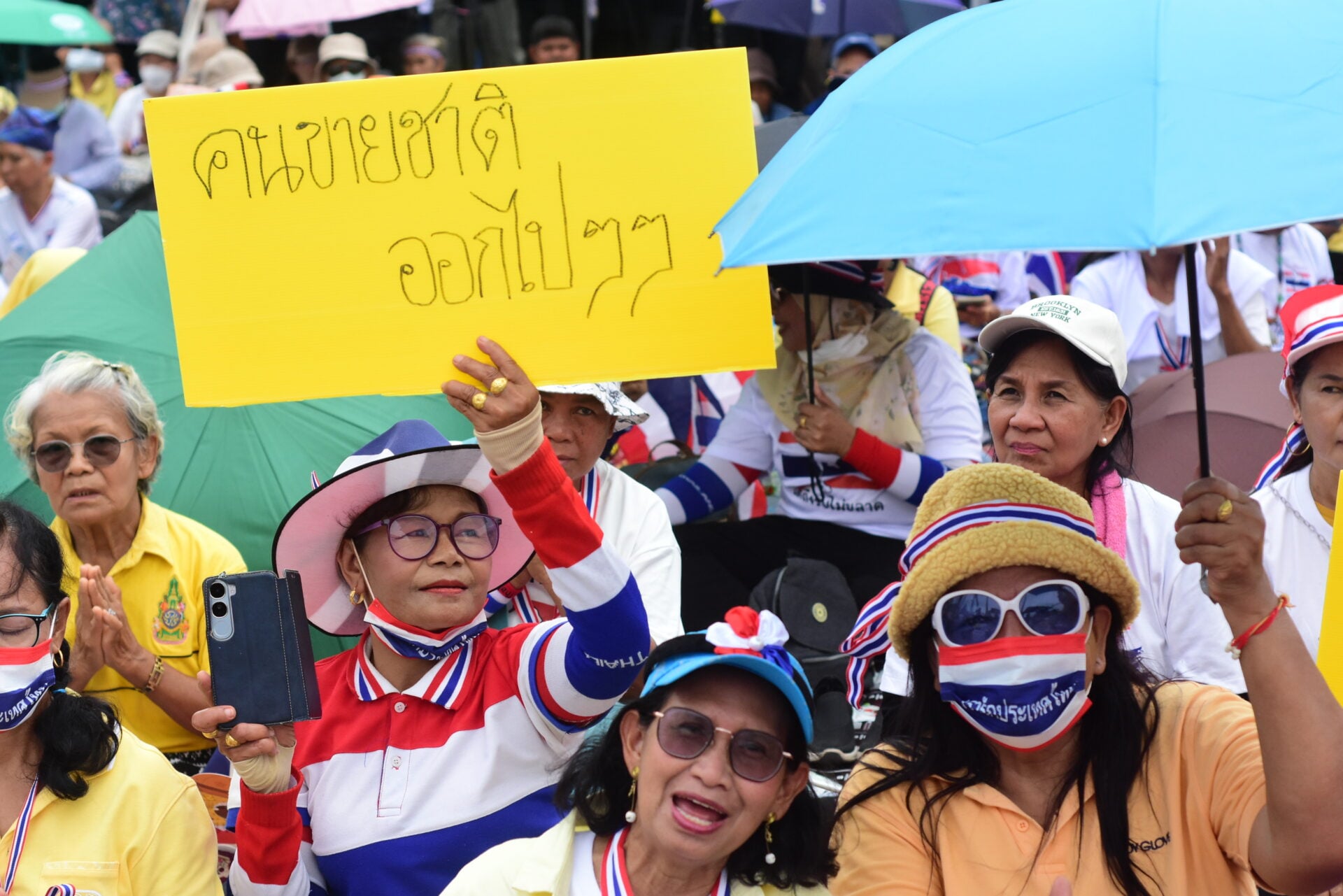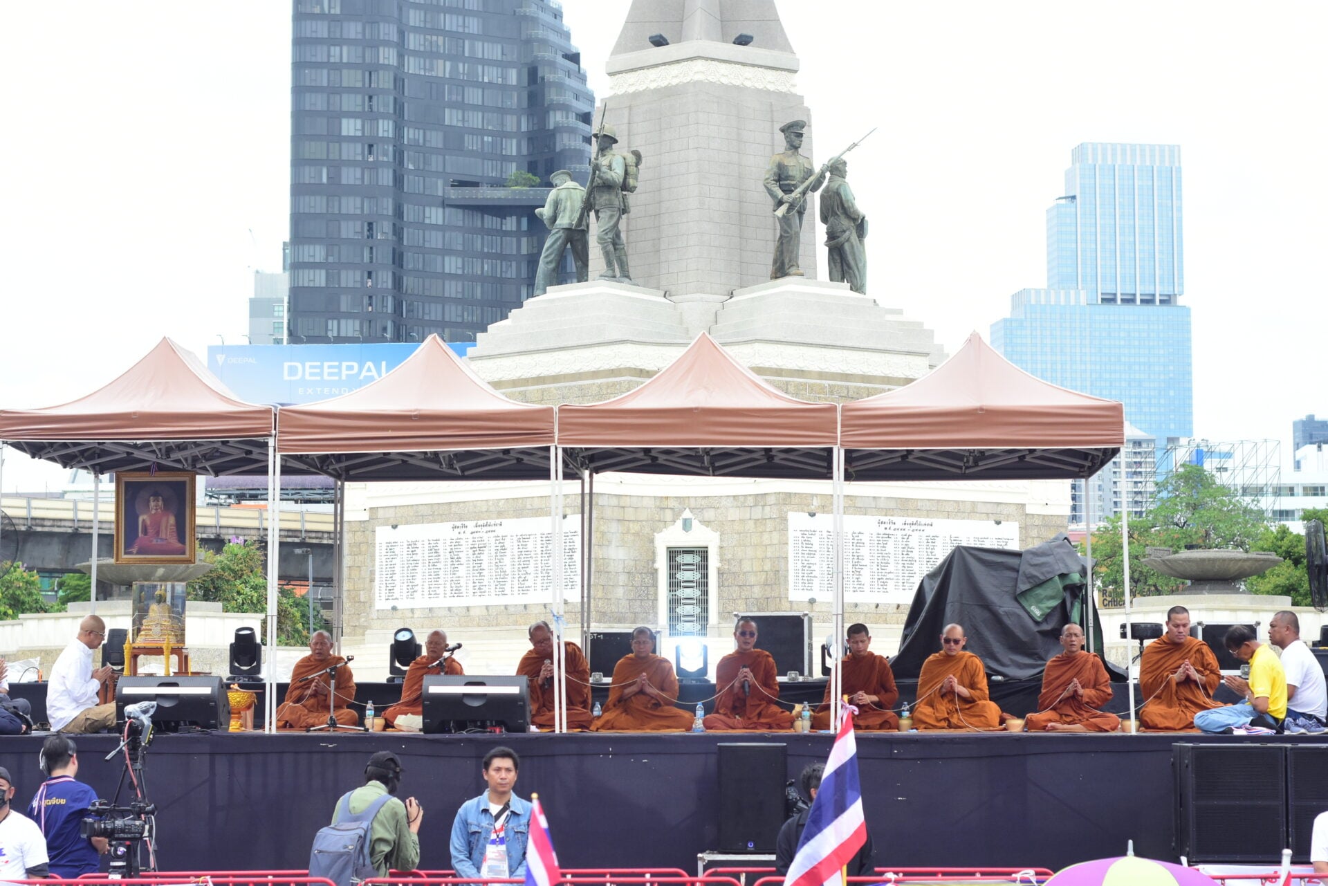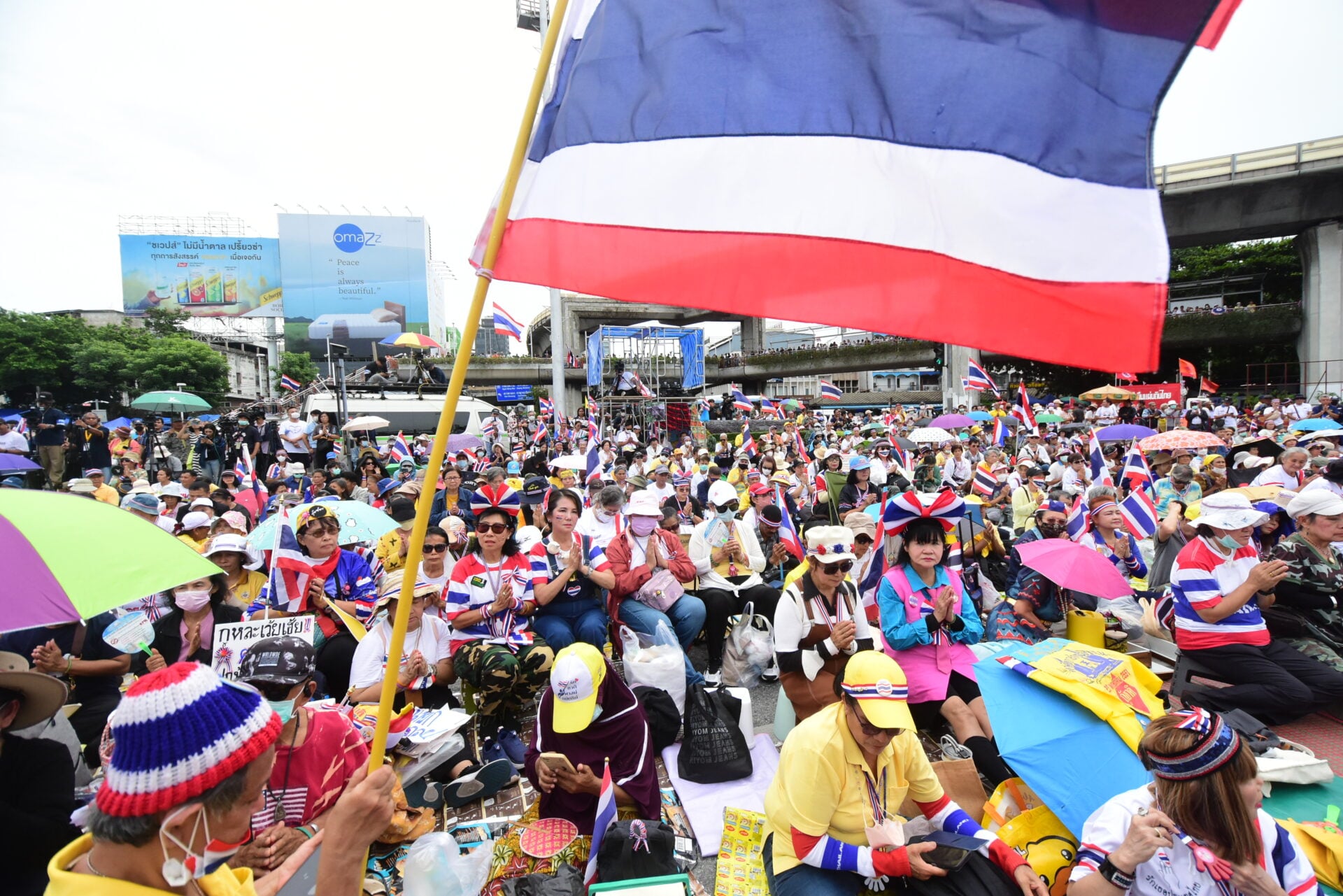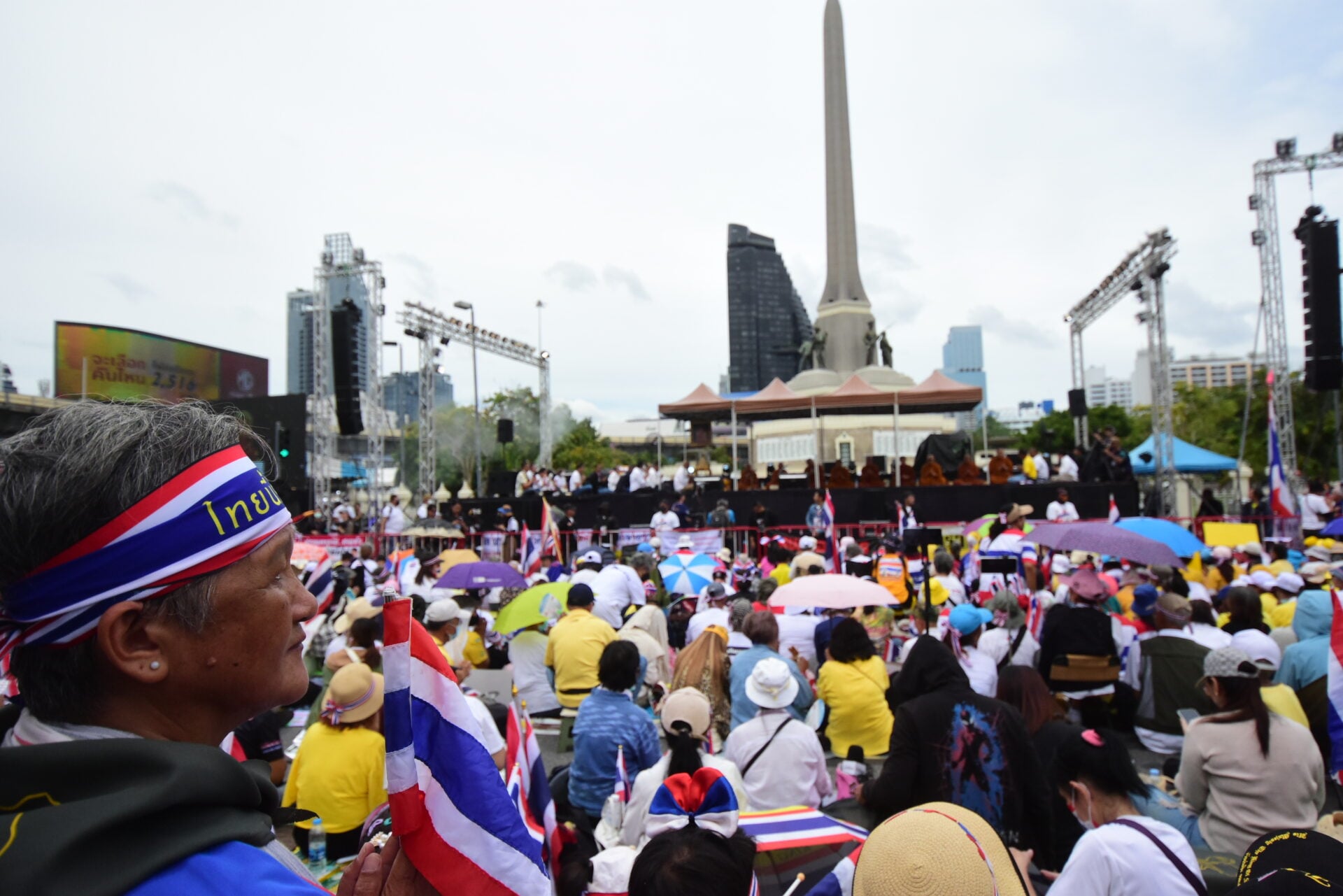 กลุ่มรวมพลังแผ่นดินปกป้องอธิปไตยทยอยจับจองพื้นที่อนุสาวรีย์ชัยฯ ตั้งแต่เช้า ผู้ชุมนุมโบกธงชาติ-ชูป้ายปกป้องอธิปไตย เตรียมเวทีบวงสรวง-ปราศรัยใหญ่ตลอดวันนี้