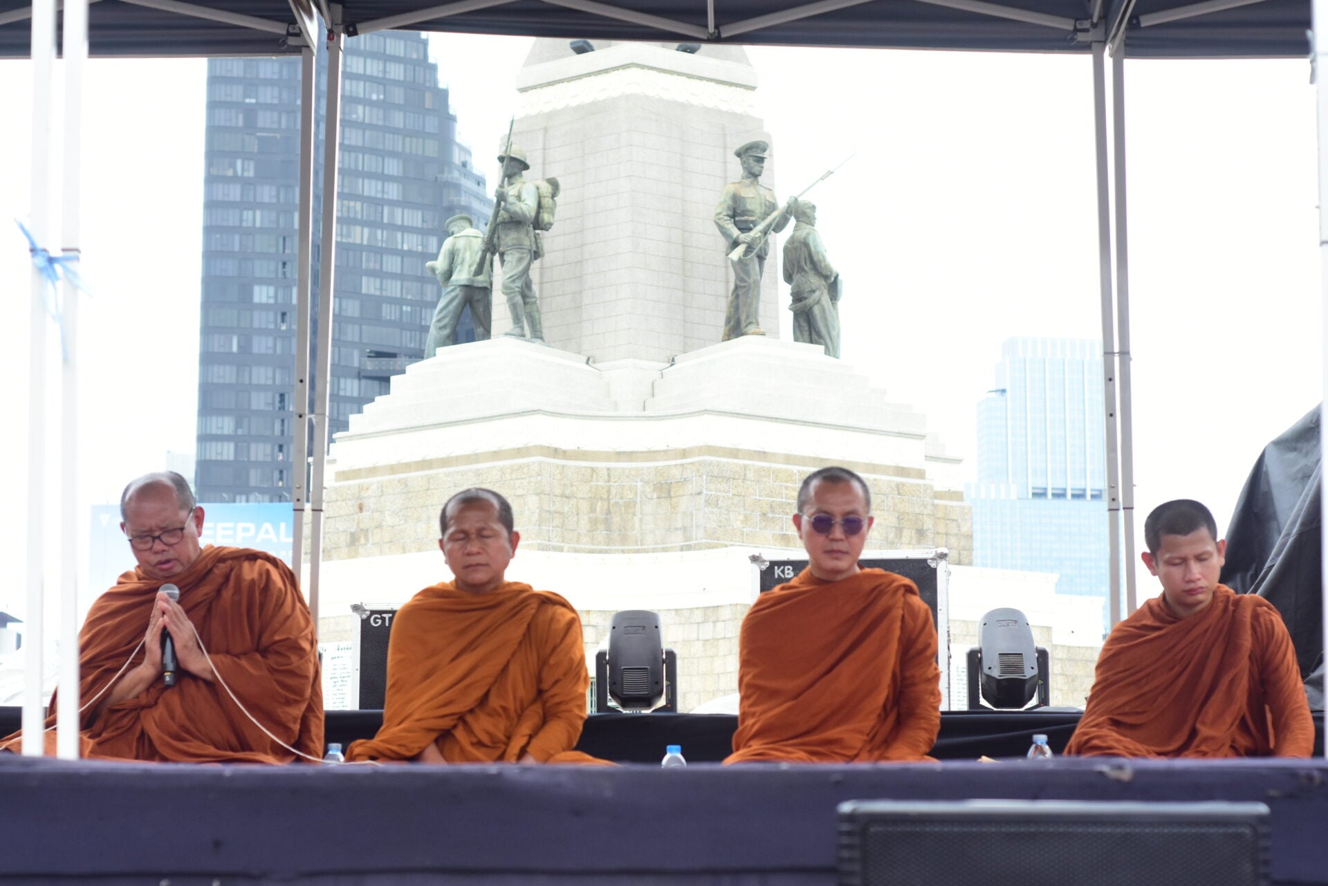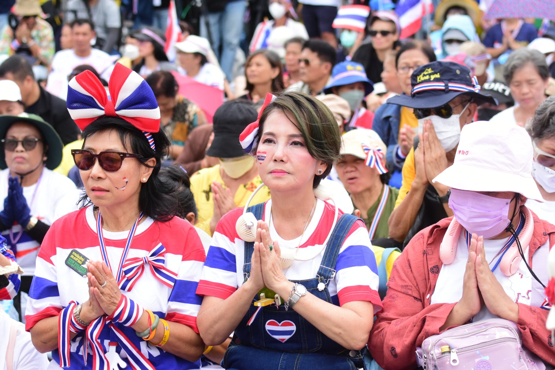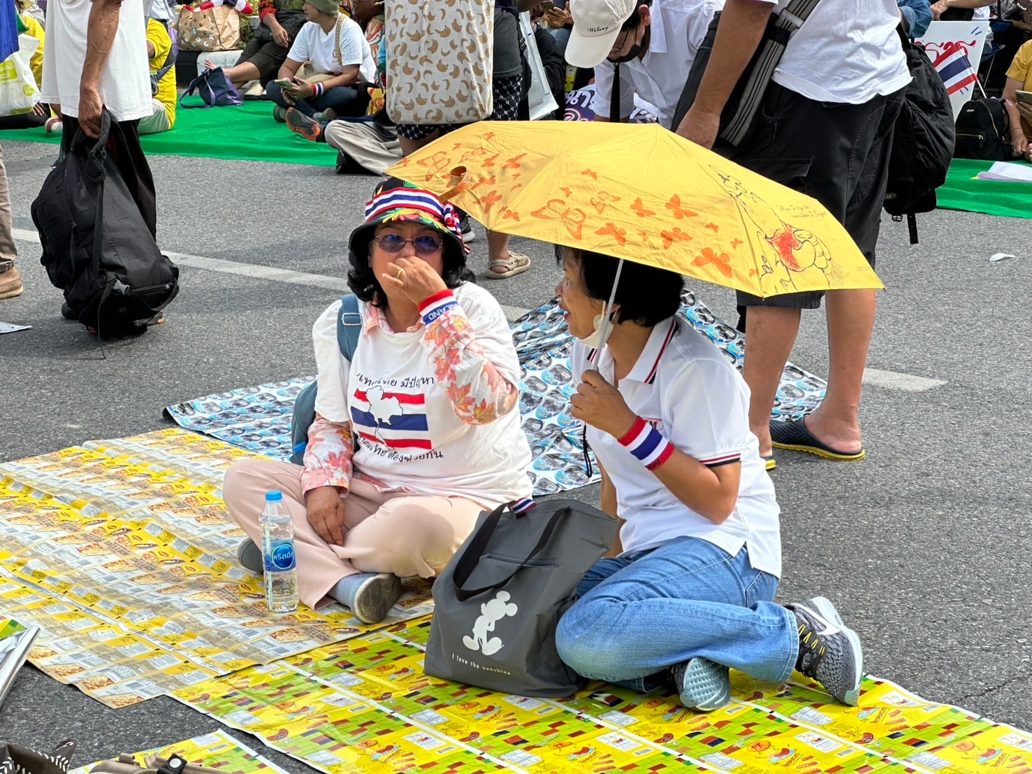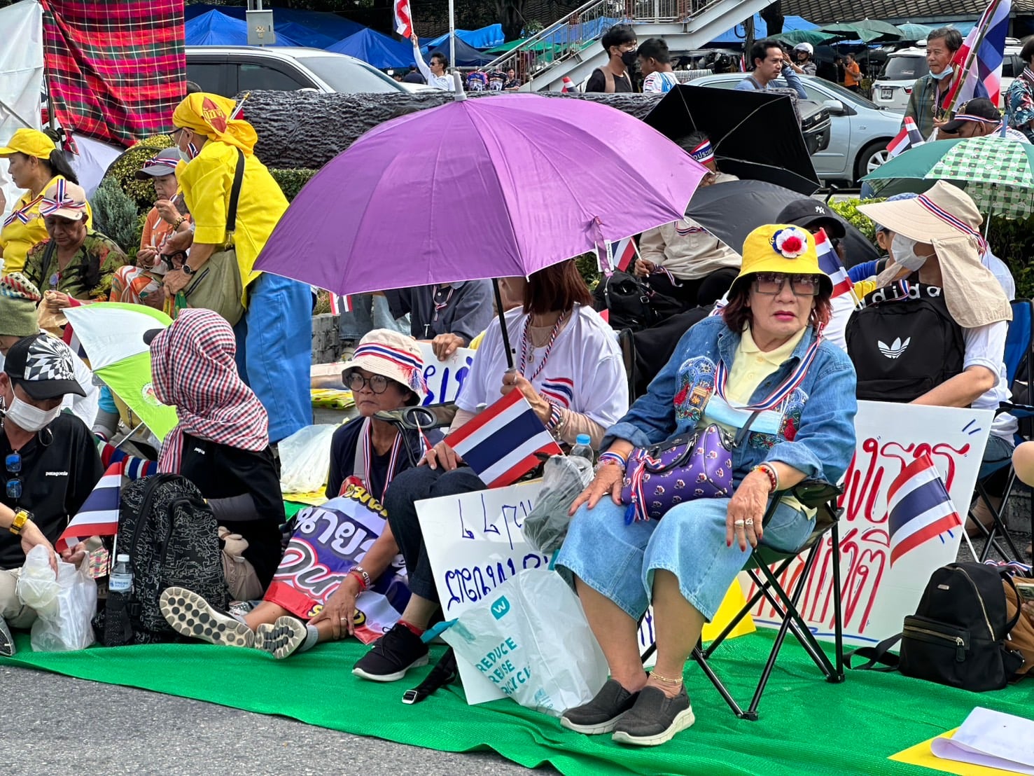 ผู้ร่วมกิจกรรมส่วนใหญ่สวมเสื้อสีขาวและสีดำ ติดริบบิ้นลายธงชาติไทย ขณะที่แกนนำเดินนำขบวนจัดระเบียบพื้นที่ มีการตั้งเต็นท์ จุดบริการน้ำดื่ม และเตรียมเวทีสำหรับพิธีบวงสรวงช่วง 10.00 น. ก่อนเริ่มการปราศรัยใหญ่ในช่วงสายของวันนี้