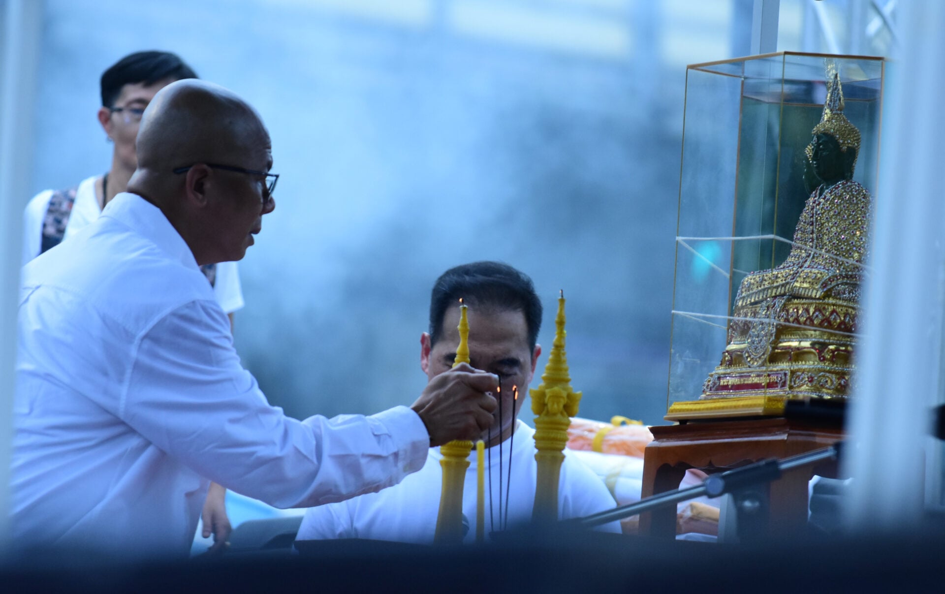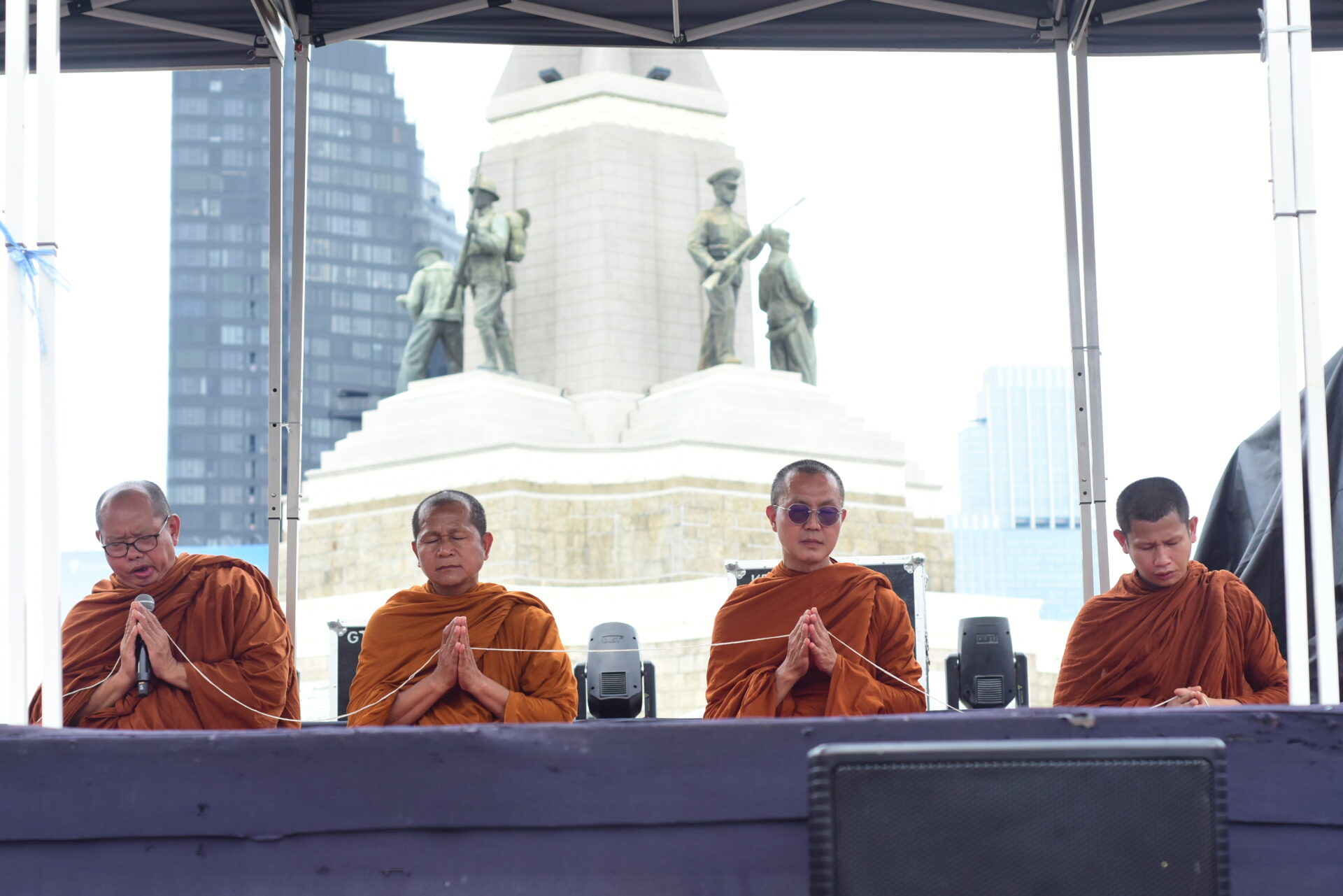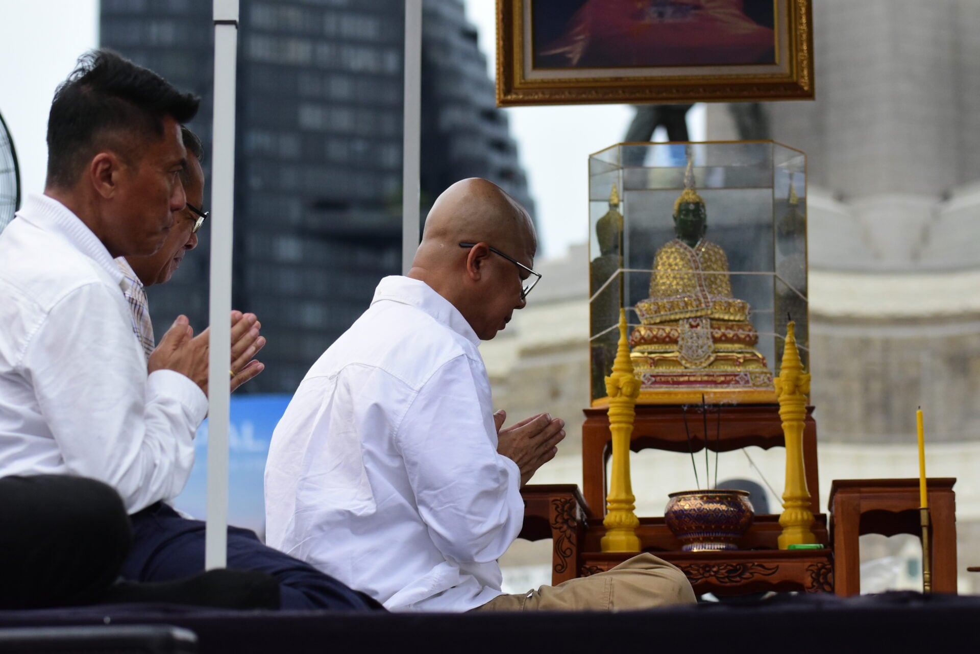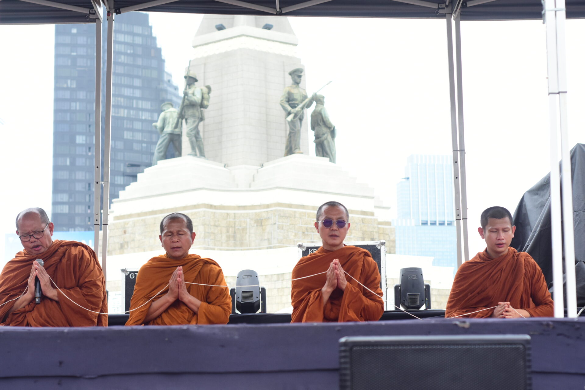 ผู้ร่วมกิจกรรมส่วนใหญ่สวมเสื้อสีขาวและสีดำ ติดริบบิ้นลายธงชาติไทย ขณะที่แกนนำเดินนำขบวนจัดระเบียบพื้นที่ มีการตั้งเต็นท์ จุดบริการน้ำดื่ม และเตรียมเวทีสำหรับพิธีบวงสรวงช่วง 10.00 น. ก่อนเริ่มการปราศรัยใหญ่ในช่วงสายของวันนี้