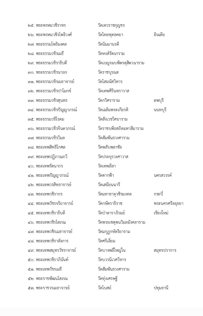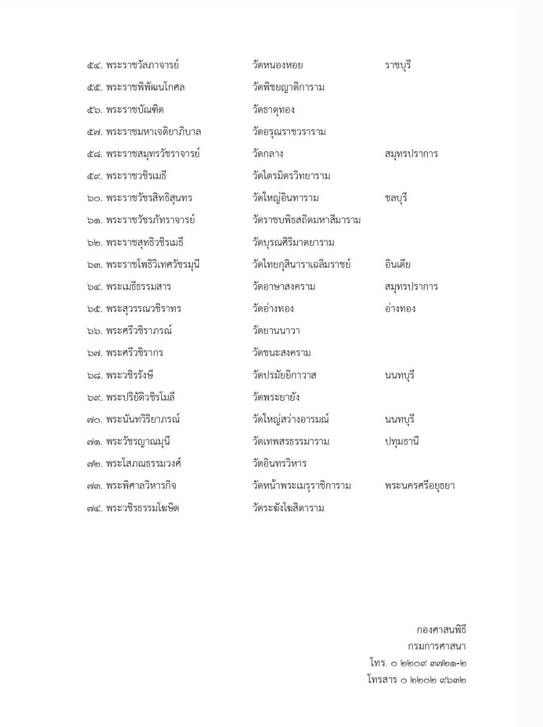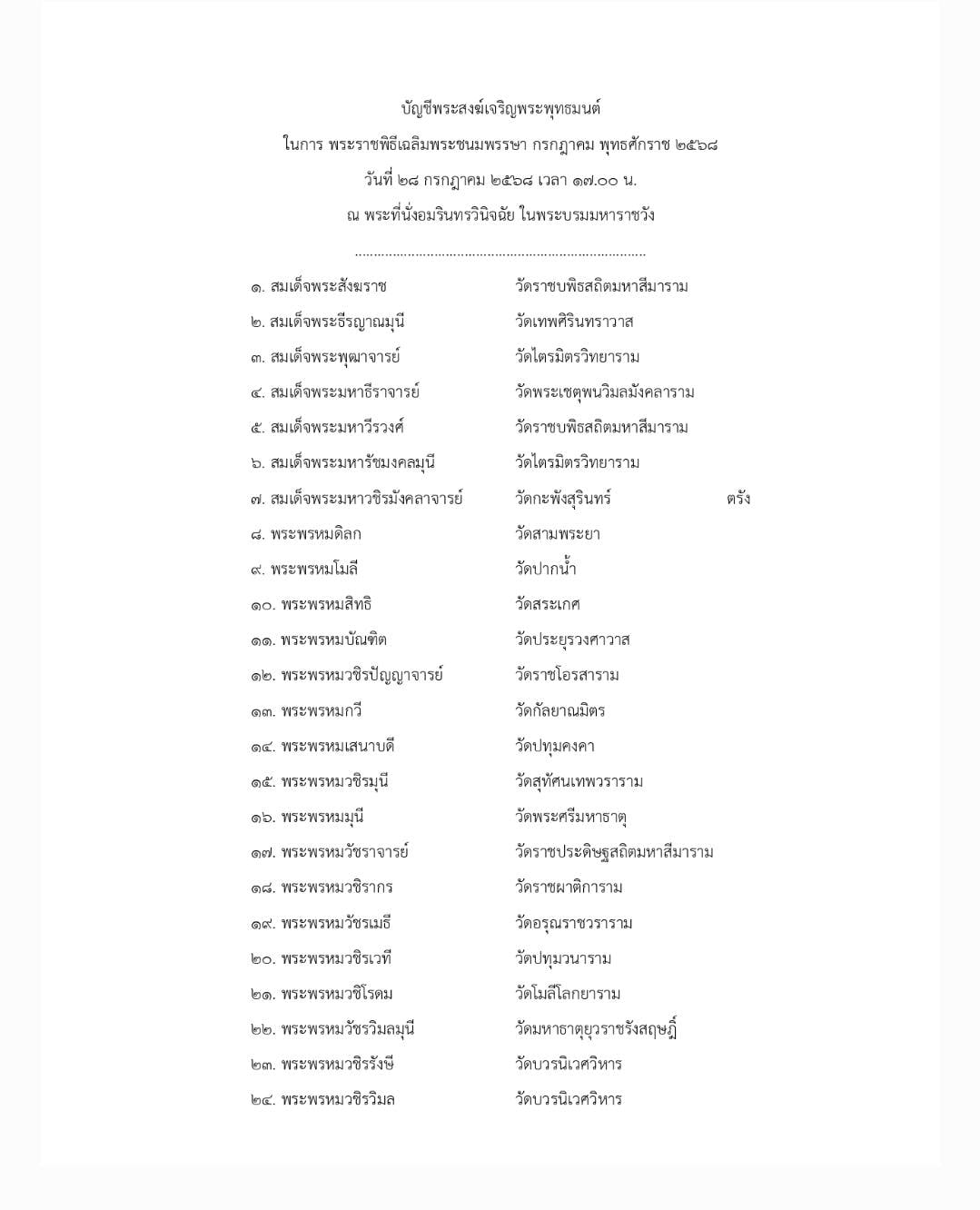 19 กรกฎาคม 2568 - เพจเฟซบุ๊ก ข่าวสารงานพระพุทธศาสนา โพสต์ภาพเอกสาร 3 หน้า จัดทำขึ้นโดยกองศาสนพิธี กรมการศาสนา มีรายละเอียดระบุถึงบัญชีพระสงฆ์เจริญพระพุทธมนต์ ในการพระราชพิธีเฉลิมพระชนมพรรษาวันที่ 28 กรกฏาคม 2568 เวลา 17.00 น. ณ พระที่นั่งอมรินทรวินิจฉัย ในพระบรมมหาราชวัง จำนวนพระภิกษุ 74 รูป ดังนี้