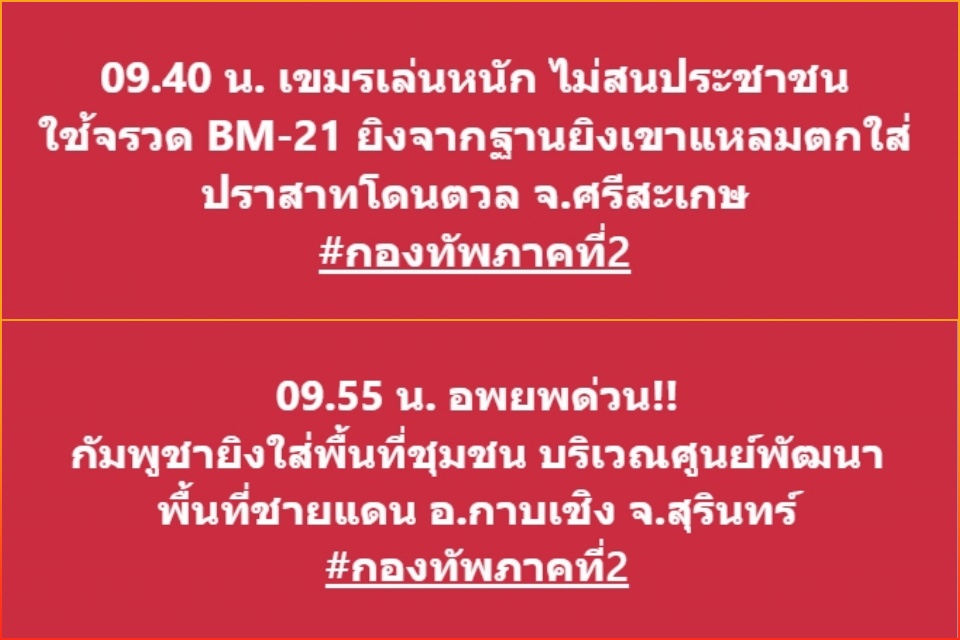 24 ก.ค.2568 – เพจกองทัพภาคที่ 2 อัปเดตสถานการณ์ทหารไทยปะทะทหารกัมพูชาว่า เวลา 09.40 น. เขมรเล่นหนัก ไม่สนประชาชน ใช้จรวด BM-21 ยิงจากฐานยิงเขาแหลมตกใส่ ปราสาทโดนตวล จ.ศรีสะเกษ