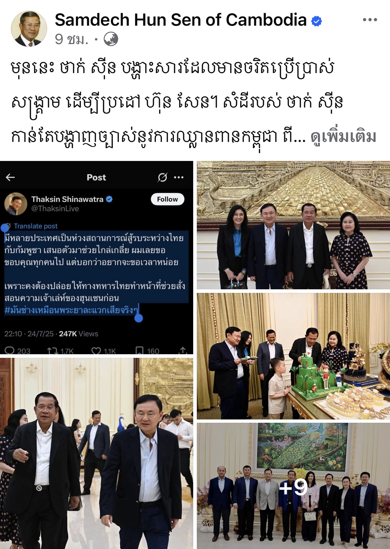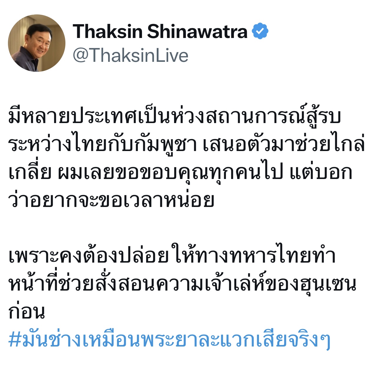 ทักษิณ ชินวัตร โพสต์ใน X ว่า “มีหลายประเทศเป็นห่วงสถานการณ์สู้รบระหว่างไทยกับกัมพูชา เสนอตัวมาช่วยไกล่เกลี่ย ผมเลยขอขอบคุณทุกคนไป แต่บอกว่าอยากจะขอเวลาหน่อย เพราะคงต้องปล่อยให้ทางทหารไทยทำหน้าที่ช่วยสั่งสอนความเจ้าเล่ห์ของฮุนเซนก่อน #มันช่างเหมือนพระยาละแวกเสียจริงๆ”