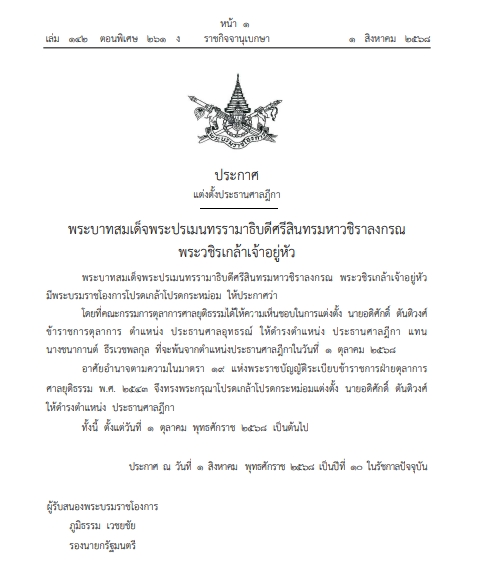 2 สิงหาคม 2568 – เว็บไซต์ราชกิจจานุเบกษา เผยแพร่ประกาศแต่งตั้งประธานศาลฎีกา