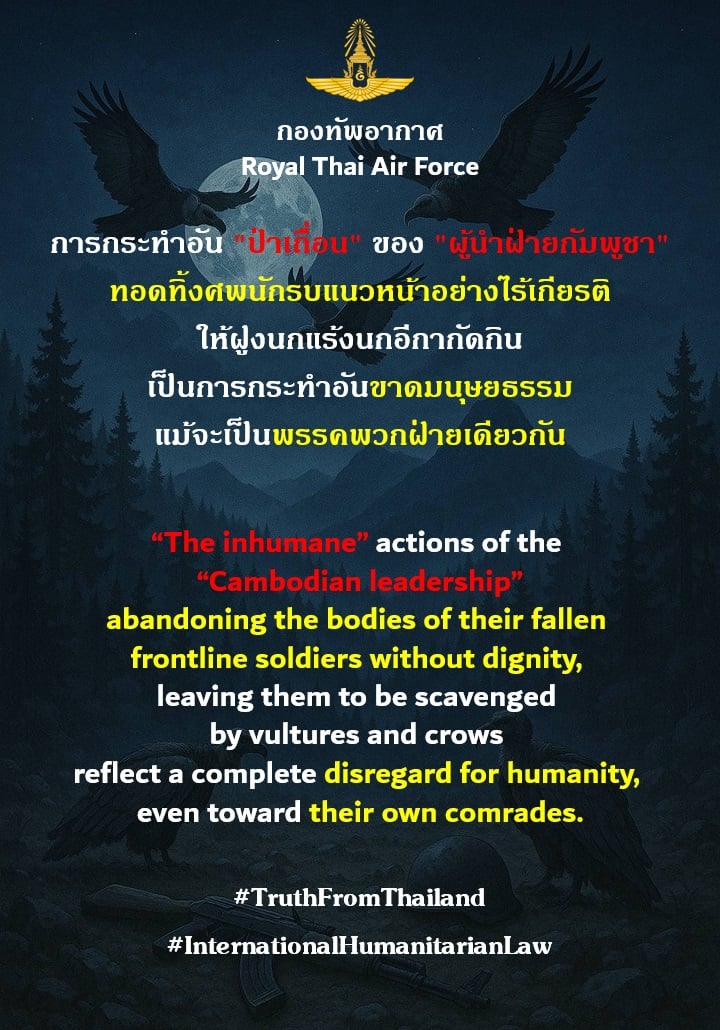 The Royal Thai Armed Forces strongly condemn the Cambodian authorities for abandoning the bodies of their fallen soldiers on the battlefield. Such an inhumane act constitutes a grave violation of international law. Those who have fallen in combat deserve to be treated with honor and dignity — not left to decay in the open. Their families are forced to endure profound sorrow, having been denied even the final opportunity to say farewell.