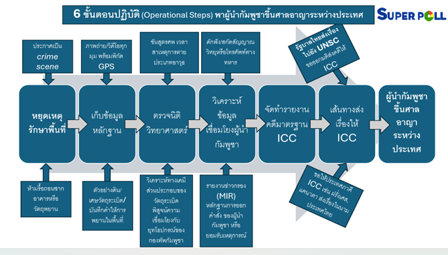หลักฐานที่จำเป็น – รวมถึงซากอาวุธและวัตถุระเบิด รายงานชันสูตรและผลตรวจนิติวิทยาศาสตร์ภาพถ่าย/วิดีโอพร้อมข้อมูลพิกัด ภาพดาวเทียม และคำให้การพยานแสดงถึงการสูญเสียของไทยที่มาจากการกระทำความผิดของฝ่ายกัมพูชา