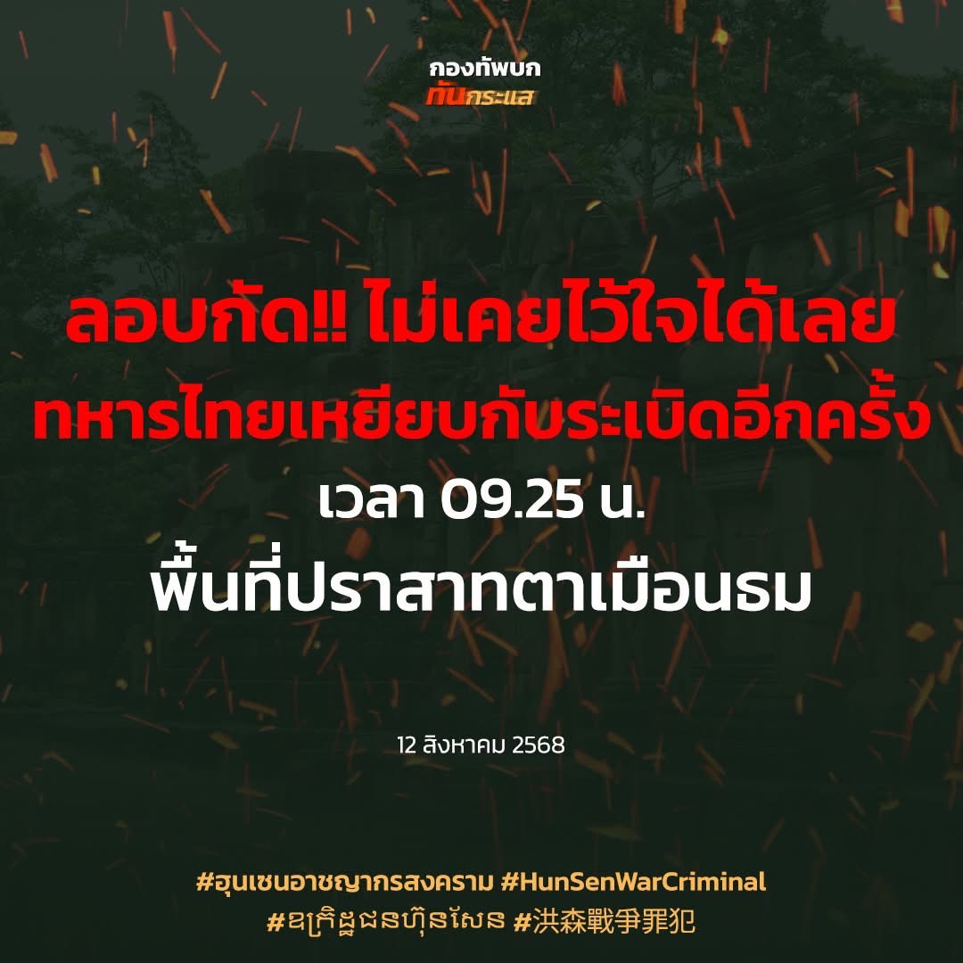 12 ส.ค.2568- พ.อ.ริชฌา สุขสุวานนท์ รองโฆษกกองทัพบกเปิดเผยว่า ในวันนี้ เมื่อเวลาประมาณ 09.10 น. กองทัพบกได้รับรายงานว่า หน่วยทหารพรานร้อย.ทพ.2610 ปฏิบัติภารกิจลาดตระเวนในพื้นที่บริเวณปราสาทตาเมือนธม อำเภอพนมดงรัก จังหวัดสุรินทร์ ได้เกิดเหตุระเบิดขึ้น ส่งผลให้กำลังพลได้รับบาดเจ็บสูญเสียขา 1 นาย ขณะนี้ได้ลำเลียงส่งโรงพยาบาลเพื่อรับการรักษาแล้ว รายละเอียดอื่นๆจะรายงานให้ทราบต่อไป