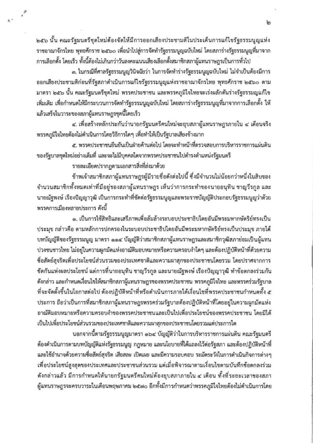 ข้าพเจ้าสมาชิกสภาผู้แทนราษฎรผู้มีรายชื่อดังต่อไปนี้ ซึ่งมีจำนวนไม่น้อยกว่า 1 ใน 10 ของจำนวนสมาชิกทั้งหมดเท่าที่มีอยู่ของสภาผู้แทนราษฎร เห็นว่าการกระทำของนายอนุทิน ชาญวีรกูล และ นายณัฐพงษ์ เรืองปัญญาวุฒิ เป็นการกระทำที่ขัดต่อรัฐธรรมนูญและพระราชบัญญัติประกอบรัฐธรรมนูญว่าด้วย พรรคการเมืองหลายประการ ดังนี้