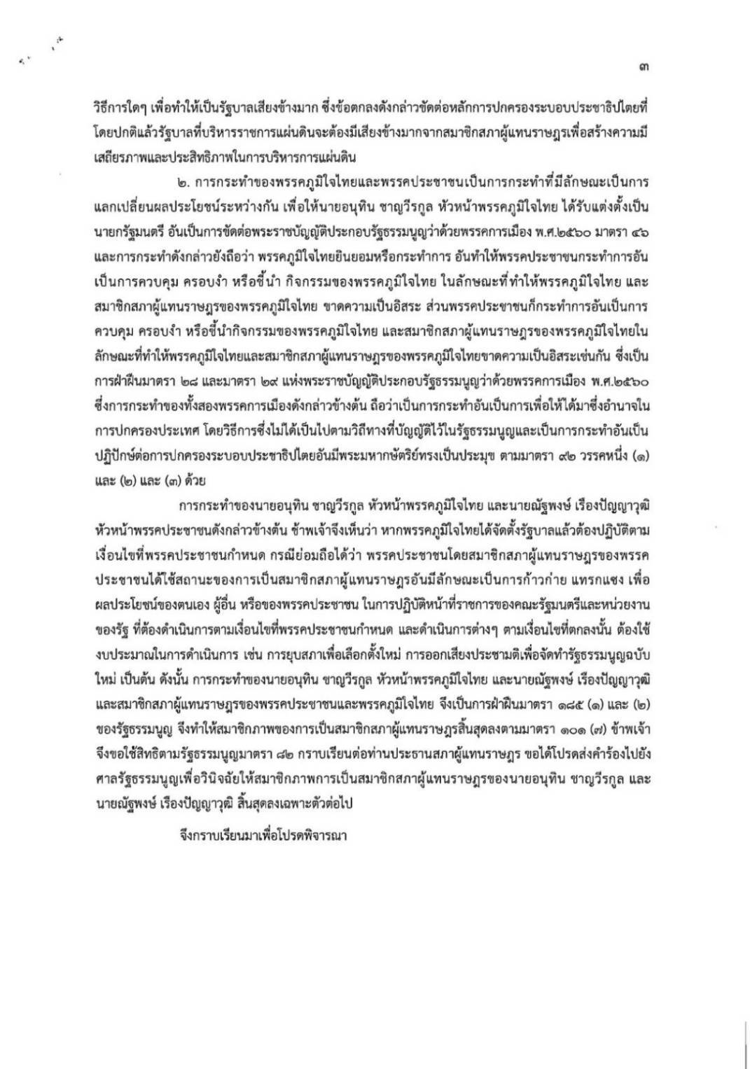 ข้าพเจ้าจึงขอใช้สิทธิตามรัฐธรรมนูญมาตรา 2 กราบเรียนต่อท่านประธานสภาผู้แทนราษฎร ขอได้โปรดส่งคำร้องไปยัง ศาลรัฐธรรมนูญเพื่อวินิจฉัยให้สมาชิกภาพการเป็นสมาชิกสภาผู้แทนราษฎรของ นายอนุทิน ชาญวีรกูล และ นายณัฐพงษ์ เรืองปัญญาวุฒิ สิ้นสุดลงเฉพาะตัวต่อไป จึงกราบเรียนมาเพื่อโปรดพิจารณา