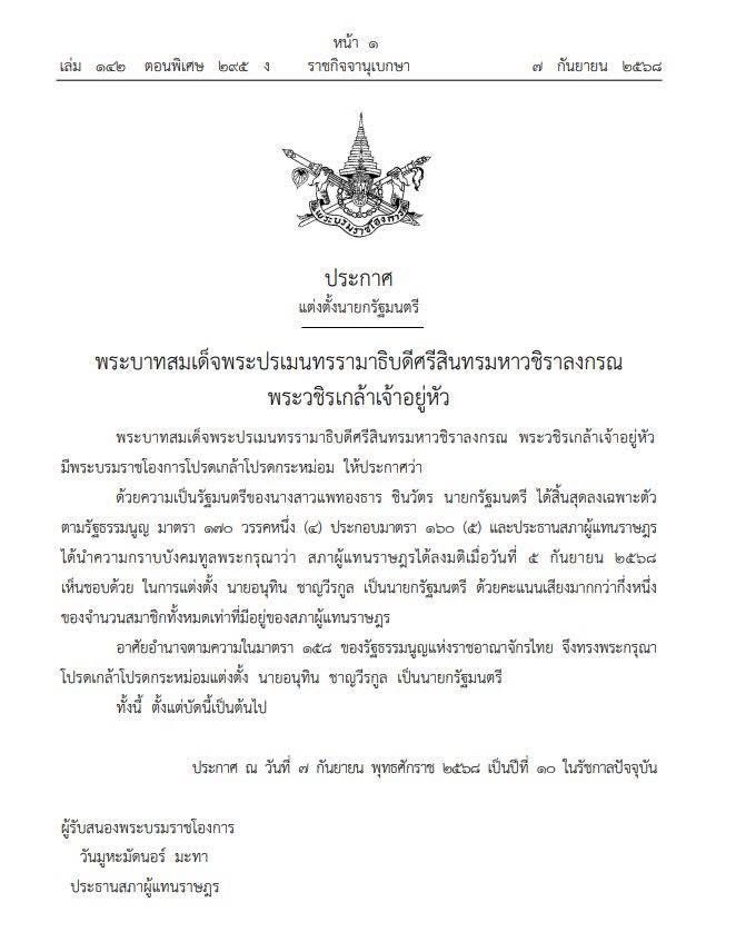 7 ก.ย. 2568 – ผู้สื่อข่าวรายงานว่า เว็บไซต์ราชกิจจานุเบกษาเผยแพร่ ประกาศแต่งตั้งนายกรัฐมนตรี ความว่า พระบาทสมเด็จพระปรเมนทรรามาธิบดีศรีสินทรมหาวชิราลงกรณพระวชิรเกล้าเจ้าอยู่หัว มีพระบรมราชโองการโปรดเกล้าโปรดกระหม่อม ให้ประกาศว่าด้วยความเป็นรัฐมนตรีของนางสาวแพทองธาร ชินวัตร นายกรัฐมนตรี ได้สิ้นสุดลงเฉพาะตัวตามรัฐธรรมนูญ มาตรา 170 วรรคหนึ่ง (4 ) ประกอบมาตรา 160 (5 ) และประธานสภาผู้แทนราษฎร ได้นำความกราบบังคมทูลพระกรุณาว่า สภาผู้แทนราษฎรได้ลงมติเมื่อวันที่ 5 กันยายน 2568 เห็นชอบด้วย ในการแต่งตั้ง นายอนุทิน ชาญวีรกูล เป็นนายกรัฐมนตรี ด้วยคะแนนเสียงมากกว่ากึ่งหนึ่งของจำนวนสมาชิกทั้งหมดเท่าที่มีอยู่ของสภาผู้แทนราษฎร อาศัยอำนาจตามความในมาตรา 158 ของรัฐธรรมนูญแห่งราชอาณาจักรไทย จึงทรงพระกรุณาโปรดเกล้าโปรดกระหม่อมแต่งตั้ง นายอนุทิน ชาญวีรกูล เป็นนายกรัฐมนตรี ทั้งนี้ ตั้งแต่บัดนี้เป็นต้นไป ประกาศ ณ วันที่ 7 กันยายน พุทธศักราช 2568 เป็นปีที่ 10 ในรัชกาลปัจจุบัน ผู้รับสนองพระบรมราชโองการ วันมูหะมัดนอร์ มะทา ประธานสภาผู้แทนราษฎร