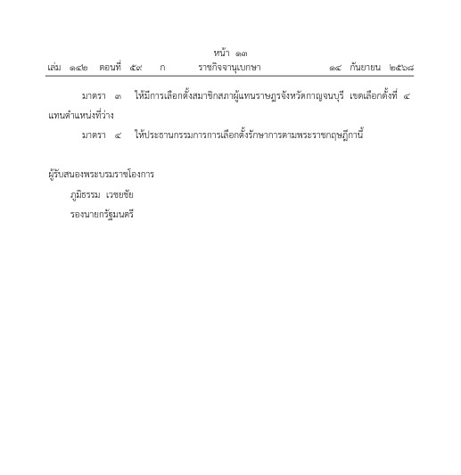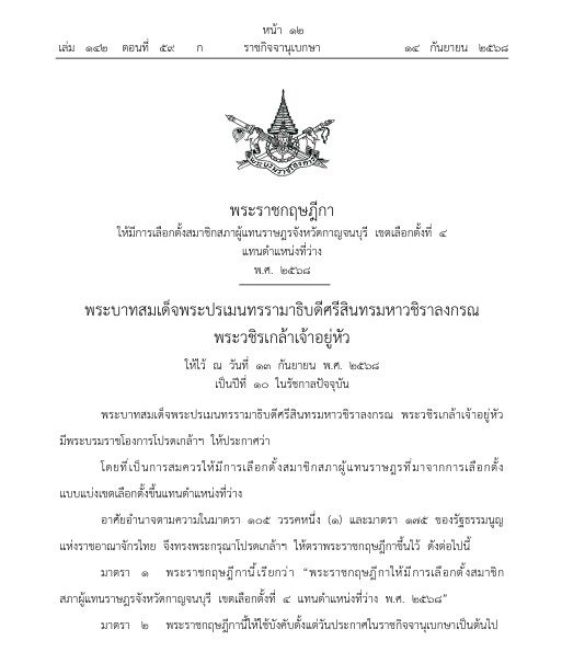 14 ก.ย.2568-เว็บไซต์ราชกิจจานุเบกษา เล่มที่ 142 ตอนที่ 59 ก เผยแพร่พระราชกฤษฎีกาให้มีการเลือกตั้งสมาชิกสภาผู้แทนราษฎรจังหวัดกาญจนบุรี เขตเลือกตั้งที่ 4 แทนตำแหน่งที่ว่าง พ.ศ. 2568 ความว่า พระบาทสมเด็จพระปรเมนทรรามาธิบดีศรีสินทรมหาวชิราลงกรณ พระวชิรเกล้าเจ้าอยู่หัว ให้ไว้ ณ วันที่ 13 กันยายน พ.ศ. 2568 เป็นปีที่ 10 ในรัชกาลปัจจุบัน มีเนื้อหาว่า