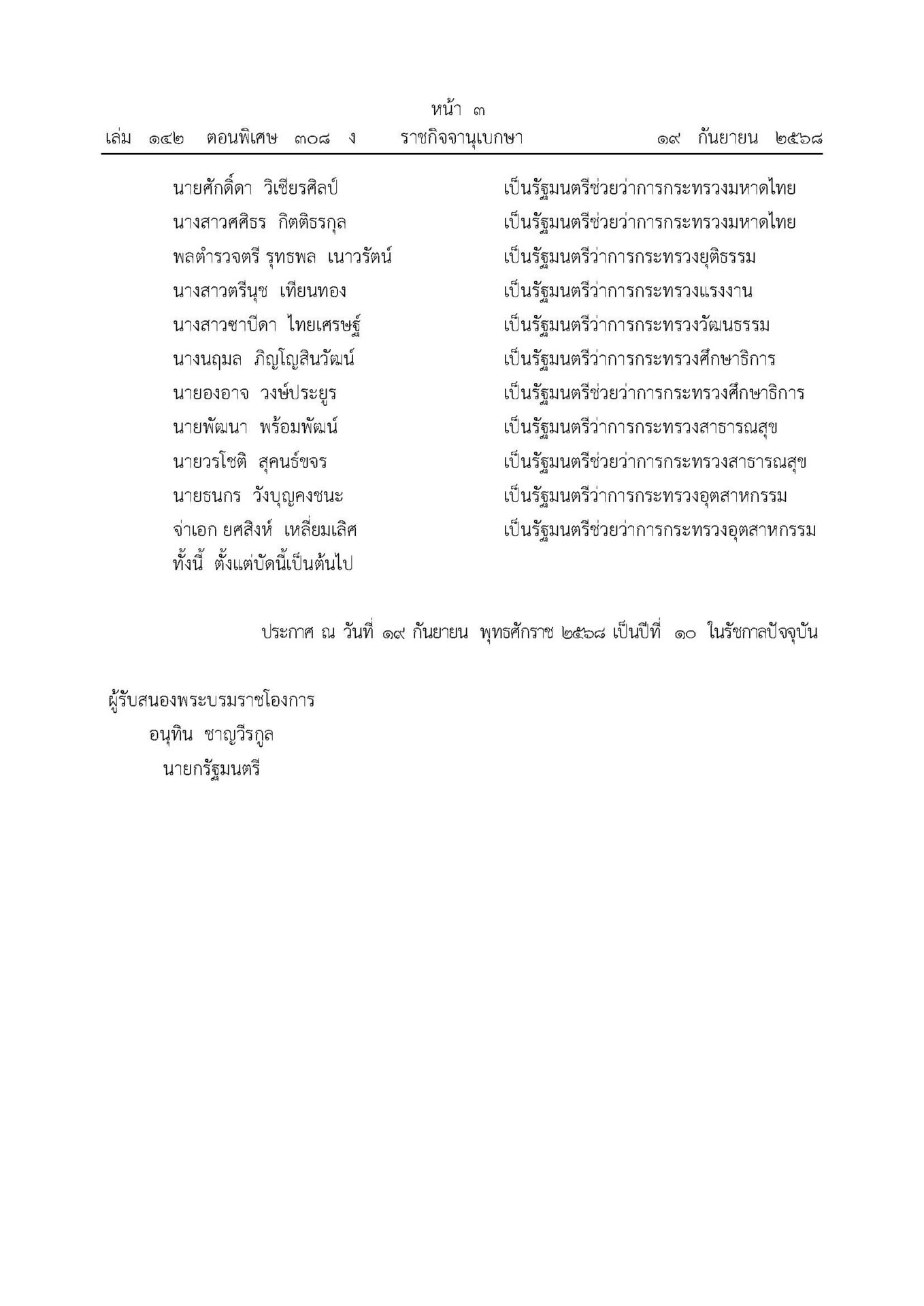 บัดนี้ นายอนุทิน ชาญวีรกูล นายกฐัมนตรี ได้เลือกสรรผู้ที่สมควรดำรงตำแหน่งรัฐมนตรี เพื่อบริหารราชการแผ่นดินสืบต่อไปแล้ว