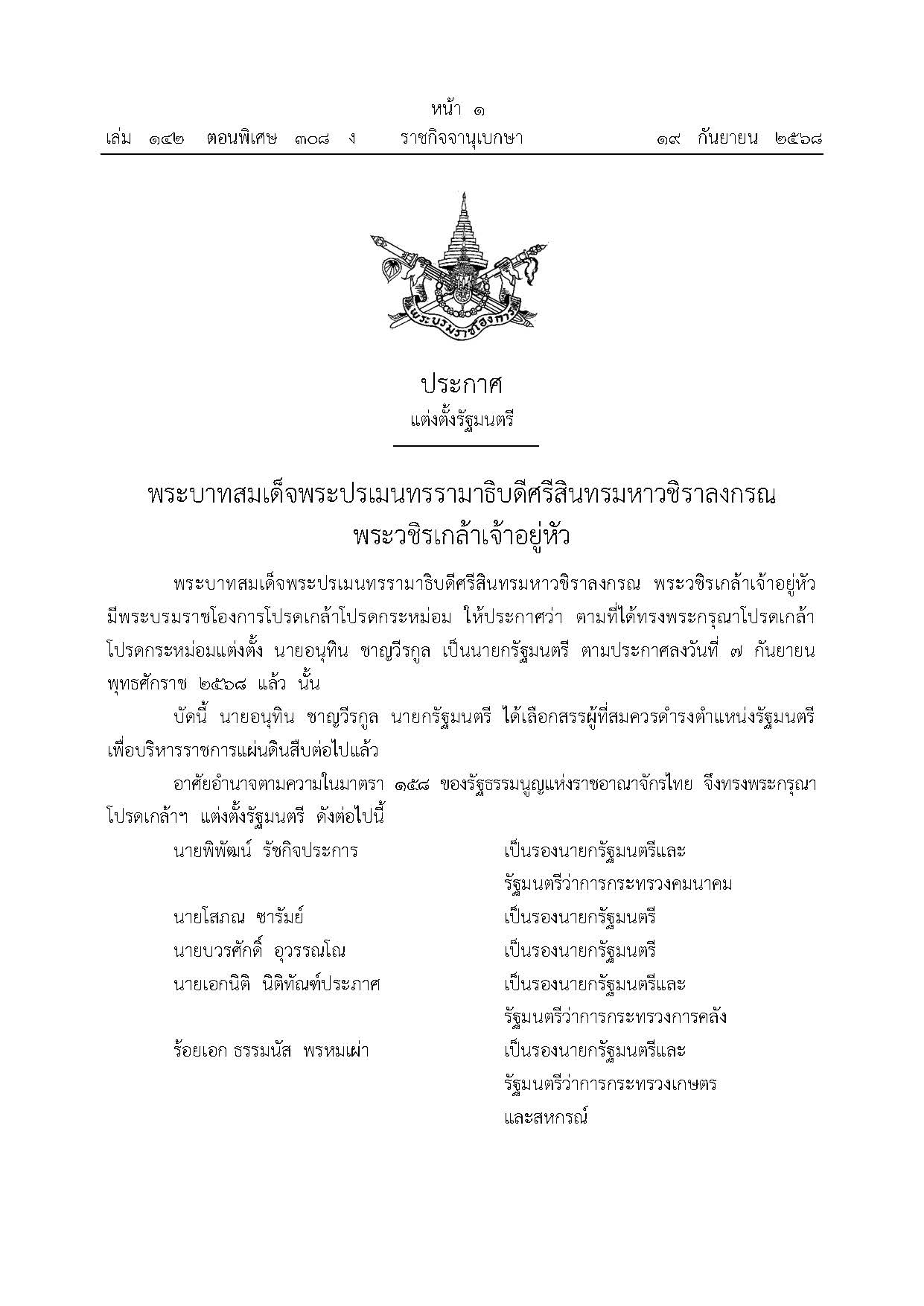 พระบาทสมเด็จพระปรเมนทรรามาธิบดีศรีสินทรมหาวชิราลงกรณ พระวชิรเกล้าเจ้าอยู่หัว มีพระบรมราชโองการโปรดเกล้าโปรดกระหม่อม ให้ประกาศว่า ตามที่ได้ทรงพระกรุณาโปรดเกล้าโปรดกระหม่อมแต่งตั้ง นายอนุทิน ชาญวีรกูล เป็นนายกรัฐมนตรี ตามประกาศลงวันที่ 7 ก.ย.2568 แล้ว นั้น